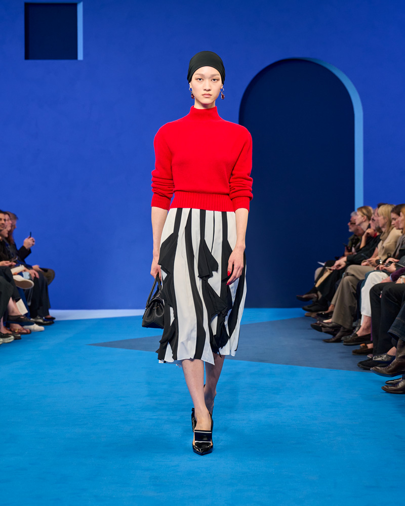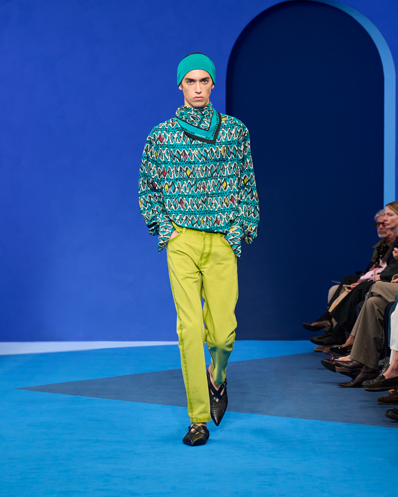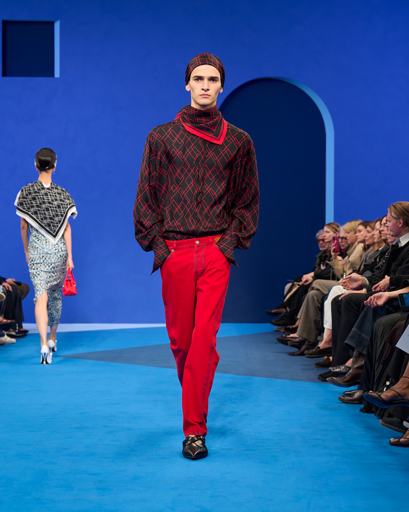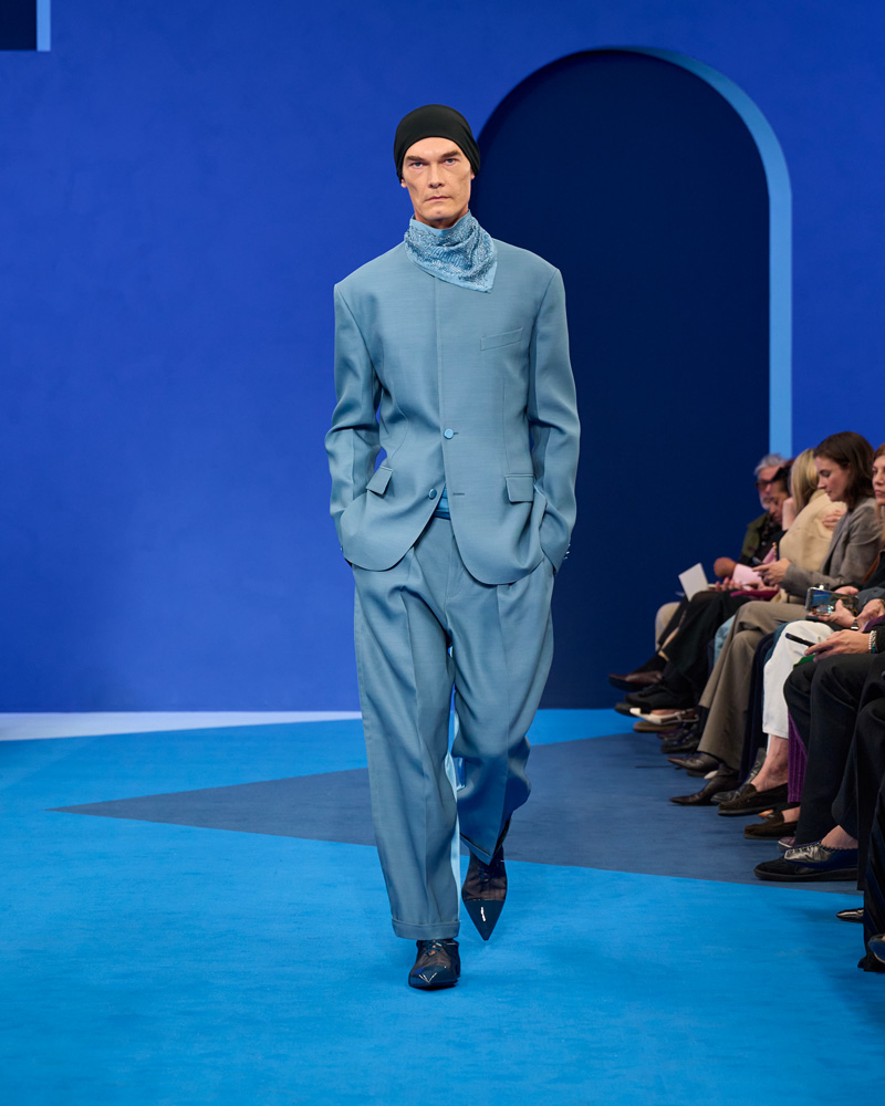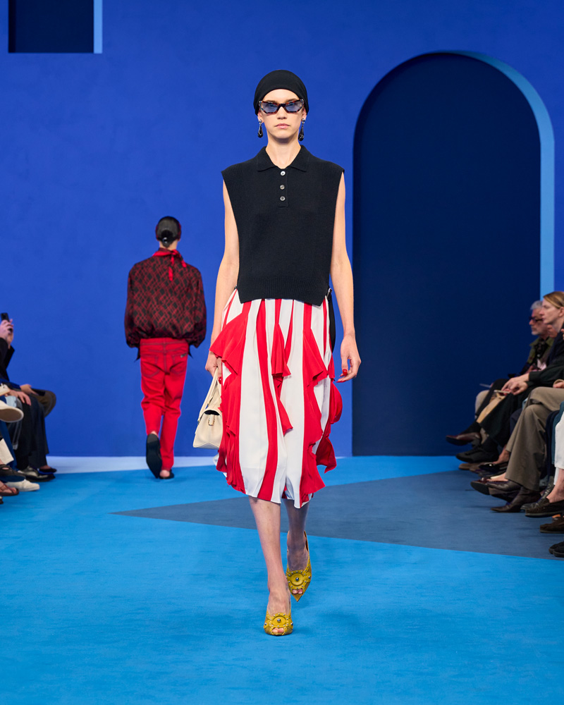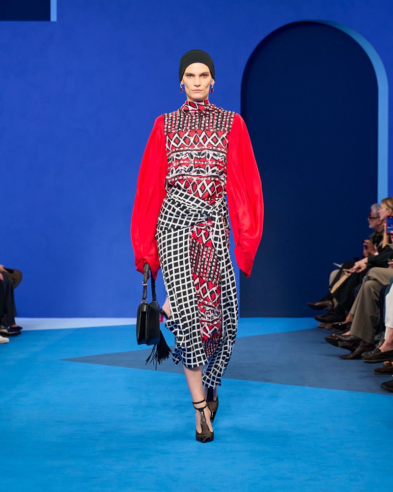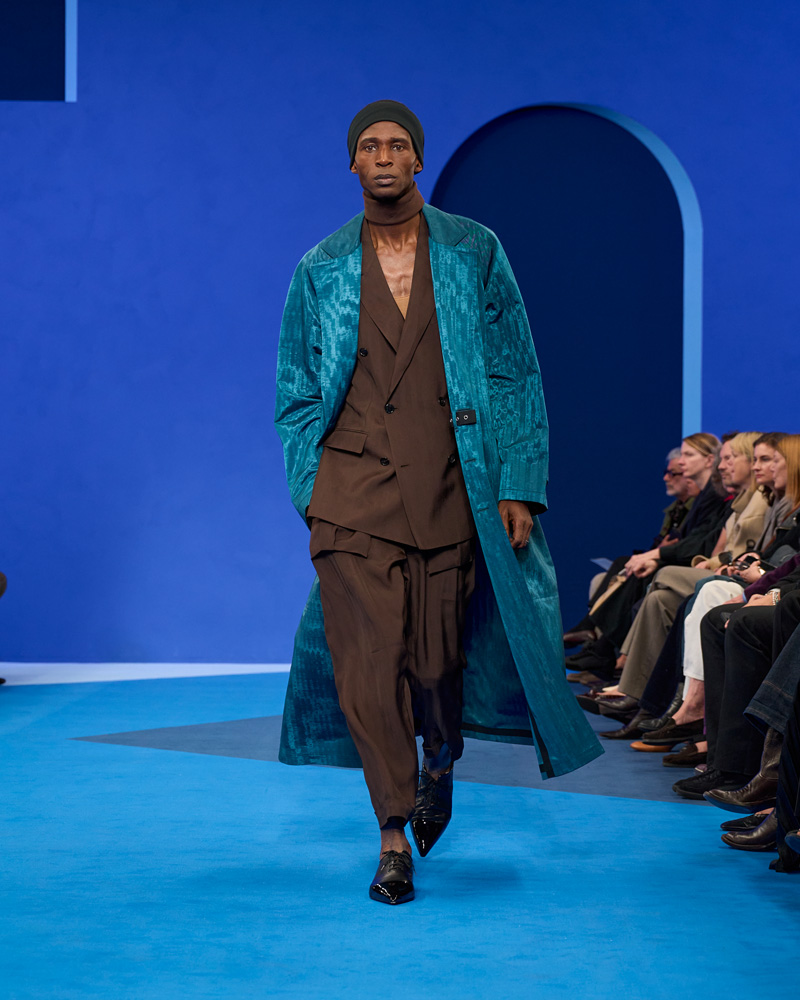 Cheveux retenus par un foulard, mains dans les poches, c’est la mise en mouvement de la modernité et de la sophistication qui animait les pièces imaginées par Jeanne Lanvin que l’on perçoit. La silhouette suivante est taillée dans un tissu noir qui s’évase en franges, autre clin d’œil à cette époque où le jazz fait danser Paris. De son côté, c’est un remix du titre Fade to Grey du groupe new wave britannique Visage qui sert de bande originale au défilé.