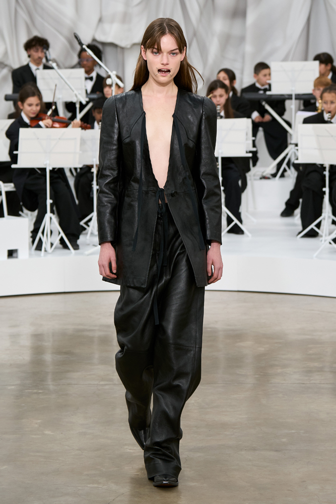 Pour le reste, Glenn Martens compose une partition maîtrisée, mêlant rigueur du tailoring et détournement des volumes. Le cuir, la laine et bien sûr le denim (matériau fétiche du créateur) s’entrelacent dans des looks sculpturaux. Le tailleur se voit réinventé avec une nouvelle construction d’épaule arrondie et une emmanchure suivant la ligne naturelle du corps, tandis que les pantalons arborent de leur côté une fourche exagérément basse, conférant un certain esprit Y2K aux silhouettes.
