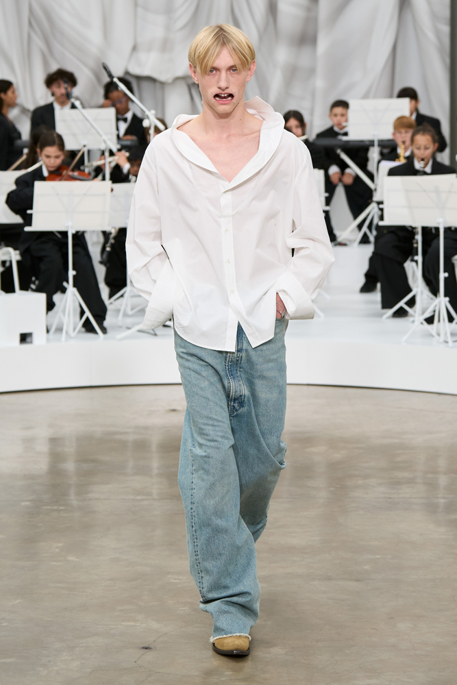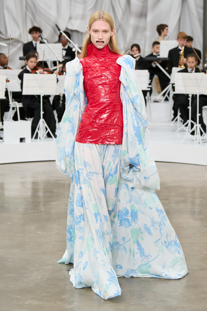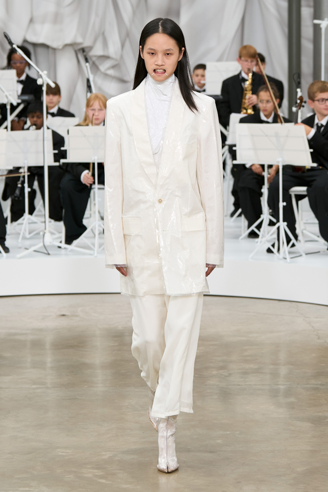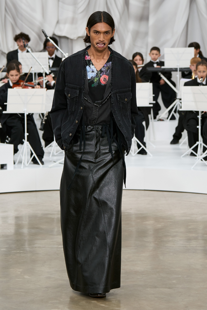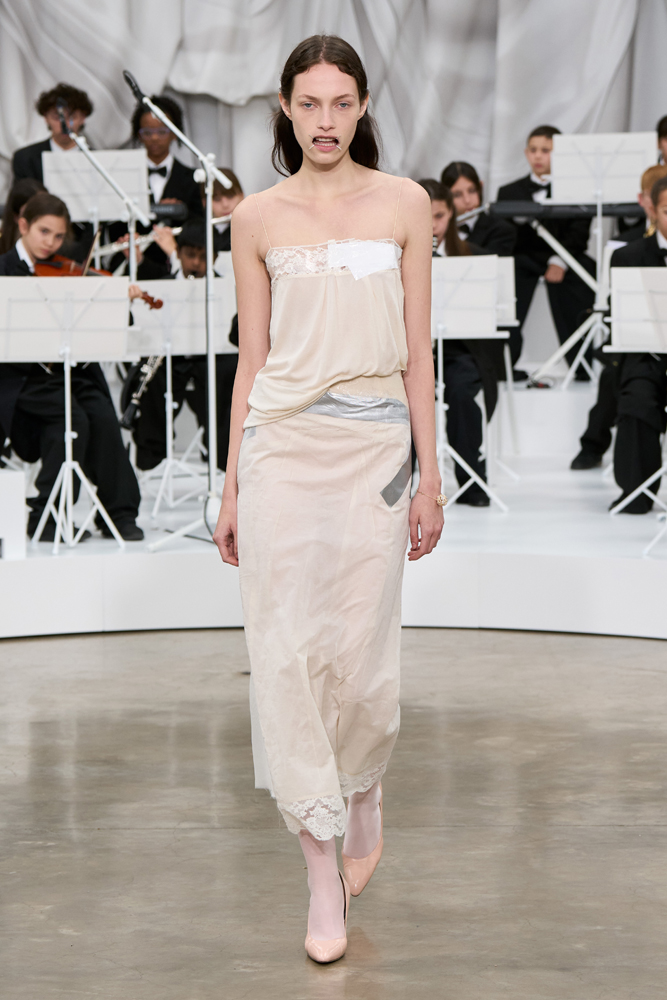Dès l’ouverture du défilé, la référence est claire. En écho au show printemps-été 1990 de Martin Margiela, Glenn Martens invite un orchestre d’enfants musiciens à composer la bande-son en direct. En 1989, le fondateur de la marque avait réservé le premier rang de son défilé aux enfants du 20e arrondissement, immortalisés dans la célèbre photo The Children Play with the Models du photographe Jean-Claude Coutausse. Trente-six ans plus tard, Glenn Martens réinvente cette fois-ci la scène avec l’idée suivante : The Children play for the models. Une manière subtile de rappeler que même si le temps passe, l’esprit irrévérencieux de Margiela reste intact.
