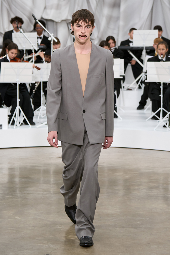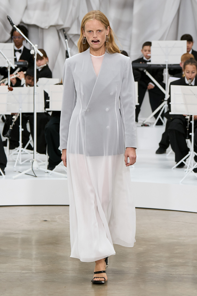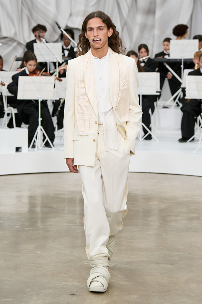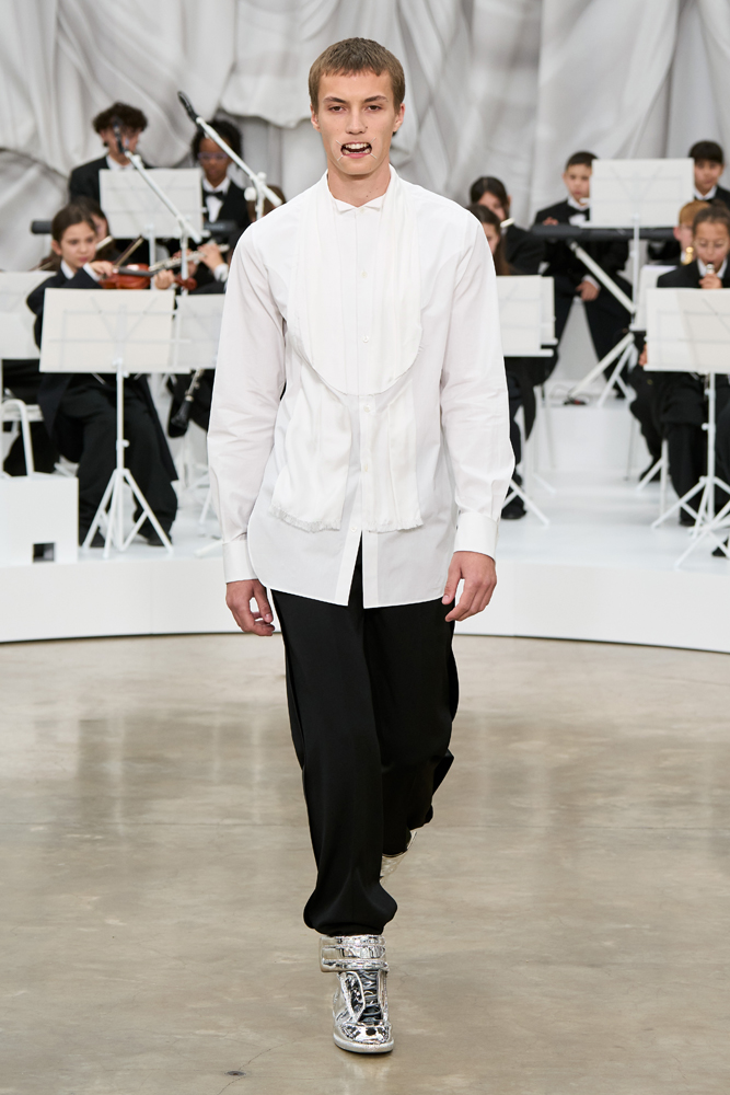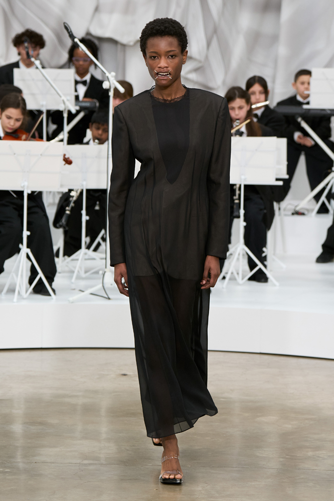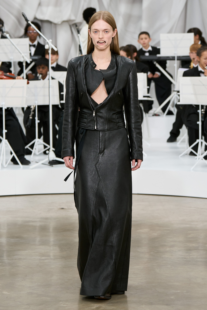Dès l’ouverture du défilé, la référence est claire. En écho au show printemps-été 1990 de Martin Margiela, Glenn Martens invite un orchestre d’enfants musiciens à composer la bande-son en direct. En 1989, le fondateur de la marque avait réservé le premier rang de son défilé aux enfants du 20e arrondissement, immortalisés dans la célèbre photo The Children Play with the Models du photographe Jean-Claude Coutausse. Trente-six ans plus tard, Glenn Martens réinvente cette fois-ci la scène avec l’idée suivante : The Children play for the models. Une manière subtile de rappeler que même si le temps passe, l’esprit irrévérencieux de Margiela reste intact.