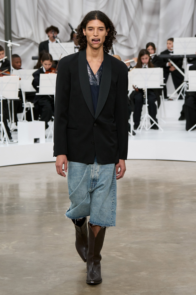 Dans la continuité de sa collection couture présentée au même endroit quelques mois plus tôt, il reprend un motif de papier peint floral du XVIe siècle, imprimé sur maille comme une sorte de tapisserie réinventée. D’autres détails viennent nourrir la mémoire de la maison. Des morceaux de scotch apposés sur une robe évoquent ainsi les tabi en cuir ficelés avec du ruban adhésif lors de la saison printemps-été 1996. Tandis que des santiags sans talons rappellent les ballerines à la même silhouette, imaginées par Martin Margiela en 2000.
