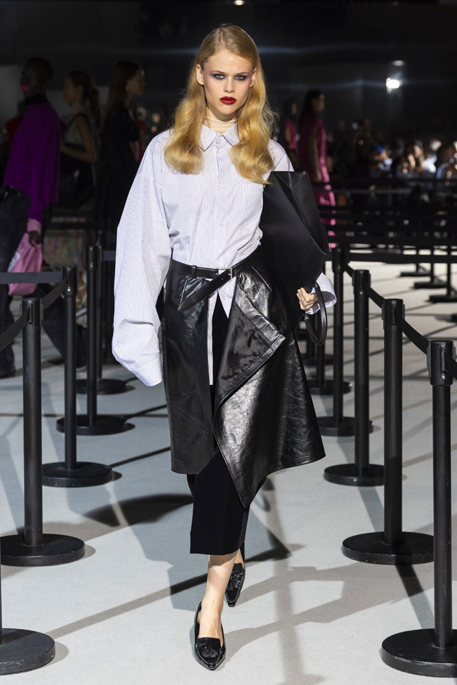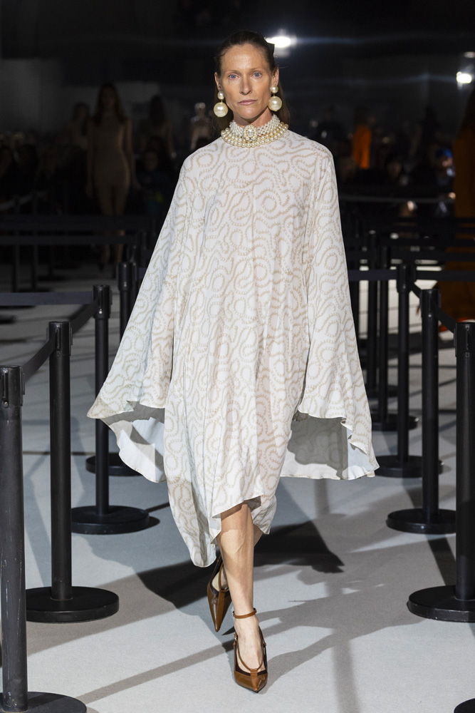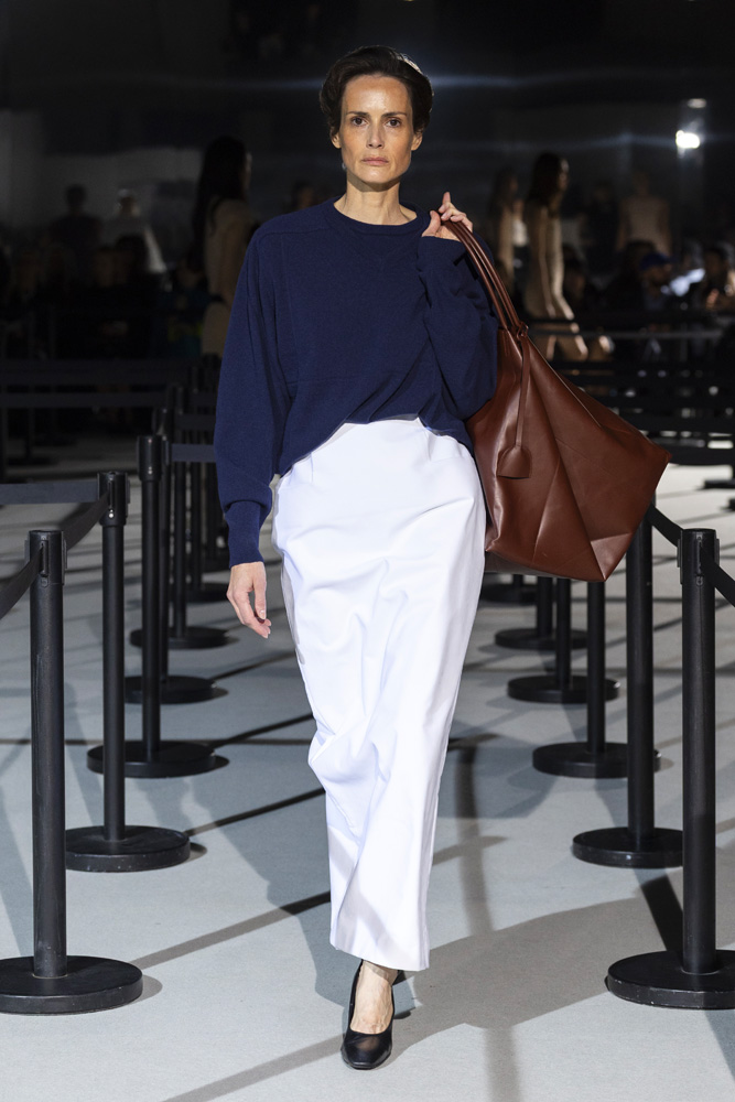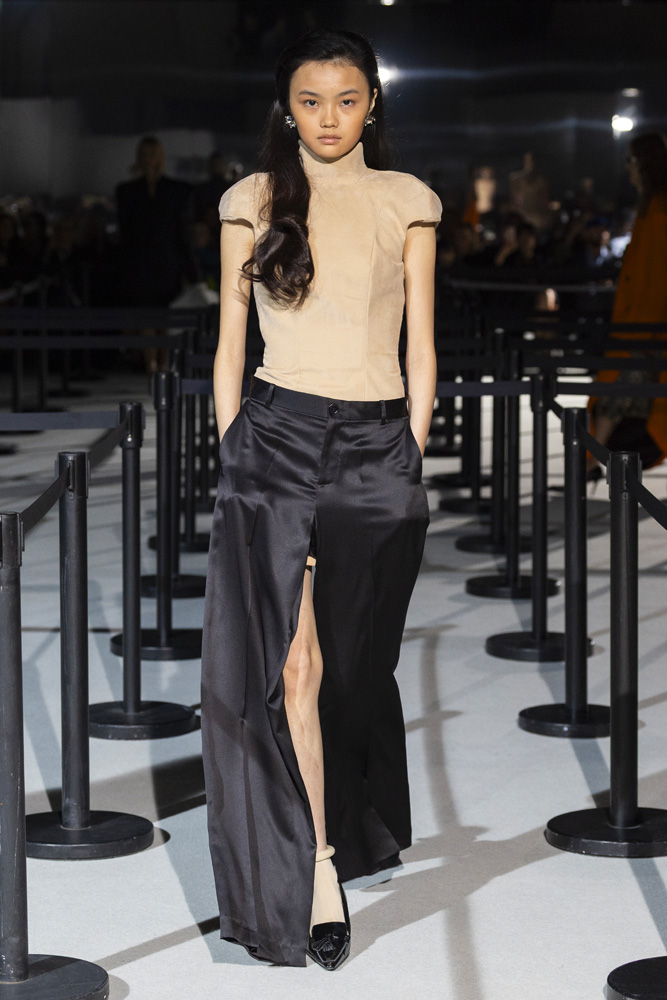 Marie Adam-Leenaerdt c’est un peu comme la fille spirituelle de Demna et Miuccia Prada. Une rigueur évidente une approche très féminine de la mode, et surtout, un goût pour l’espièglerie. Pressées, les femmes de son défilé printemps-été 2026 se sont habillées à la va-vite, oubliant de fermer leur ceinture. Les tailleurs et trenchs sont modulables, le style est à décliner selon l’humeur.