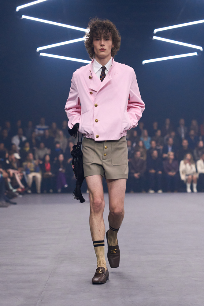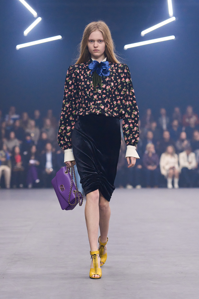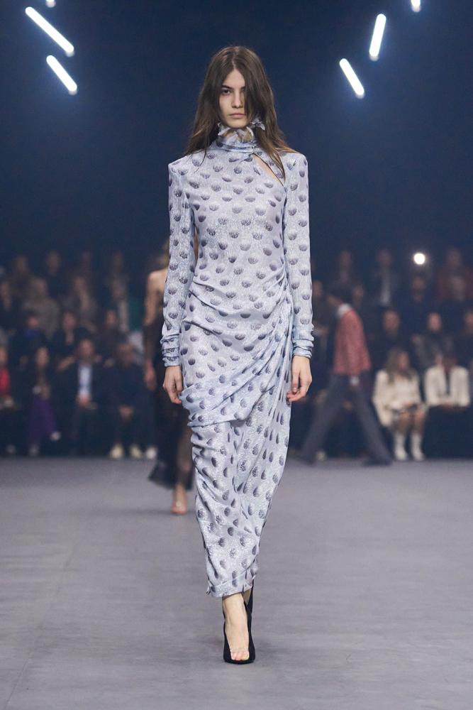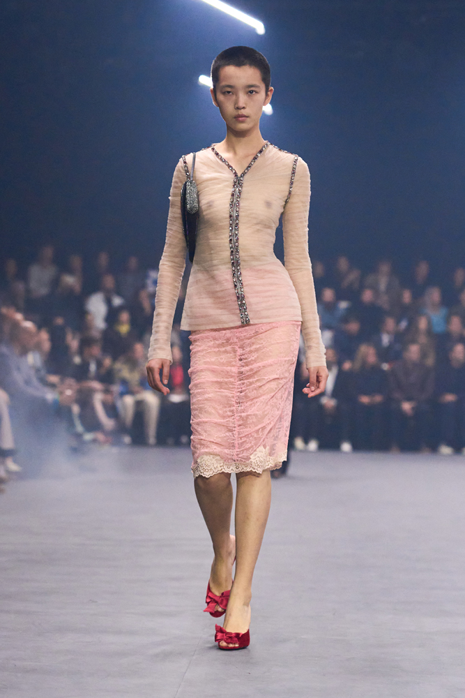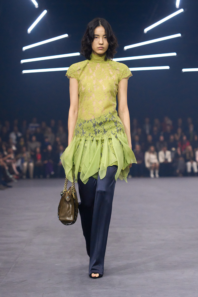 Une chemise drapée rappelle plus tard les plis d’un vêtement ancien, tandis qu’une robe en soie brodée effleure le sol avec grâce. Les coupes, fluides et allongées, évoquent ici une certaine sensualité, marquée notamment par l’apparition de silhouettes masculines jouant sur la transparence. Sans renier les codes de la maison, Alessandro Michele les réinterprète avec subtilité. Le romantisme baroque, signature du créateur, se fait plus apaisé.