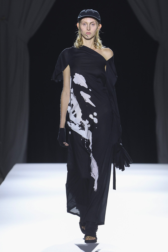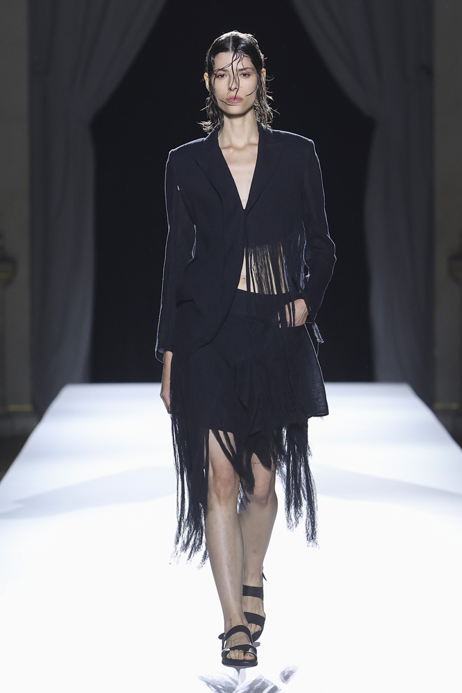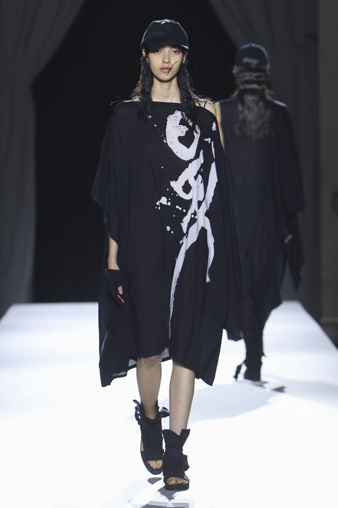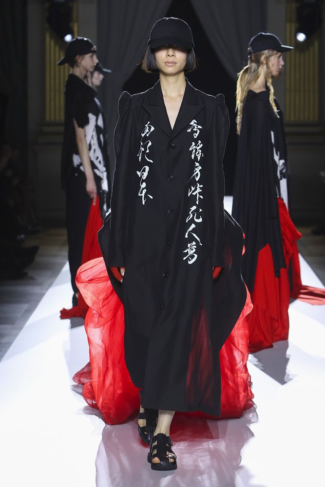 C’est un exercice de style autant que de méditation que nous proposait Yohji Yamamoto. Un rappel aussi à apprécier la fugacité du présent, à l’honorer. Vers la fin du défilé, il a d’ailleurs dédié deux silhouettes en hommage à Giorgio Armani, décédé en septembre dernier. La première ornée d’une calligraphie japonaise sur le devant et d’une photo de la campagne Giorgio Armani de 1998 avec la mannequin Shalom Harlow dans le dos ; l’autre avec l’invitation au 50e défilé Armani et Kristen McMenamy en smoking de 1997.