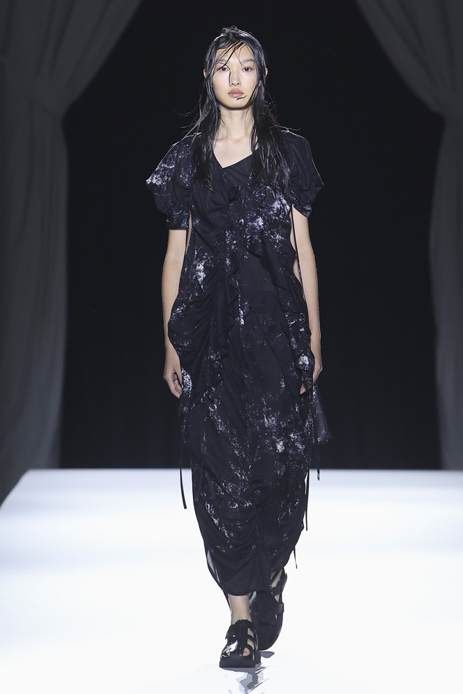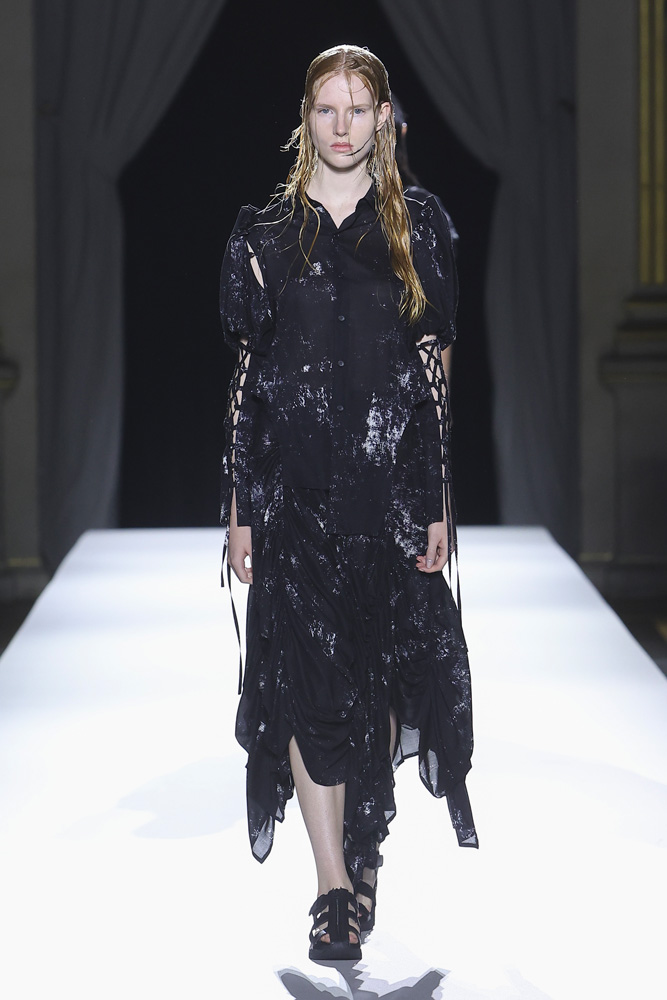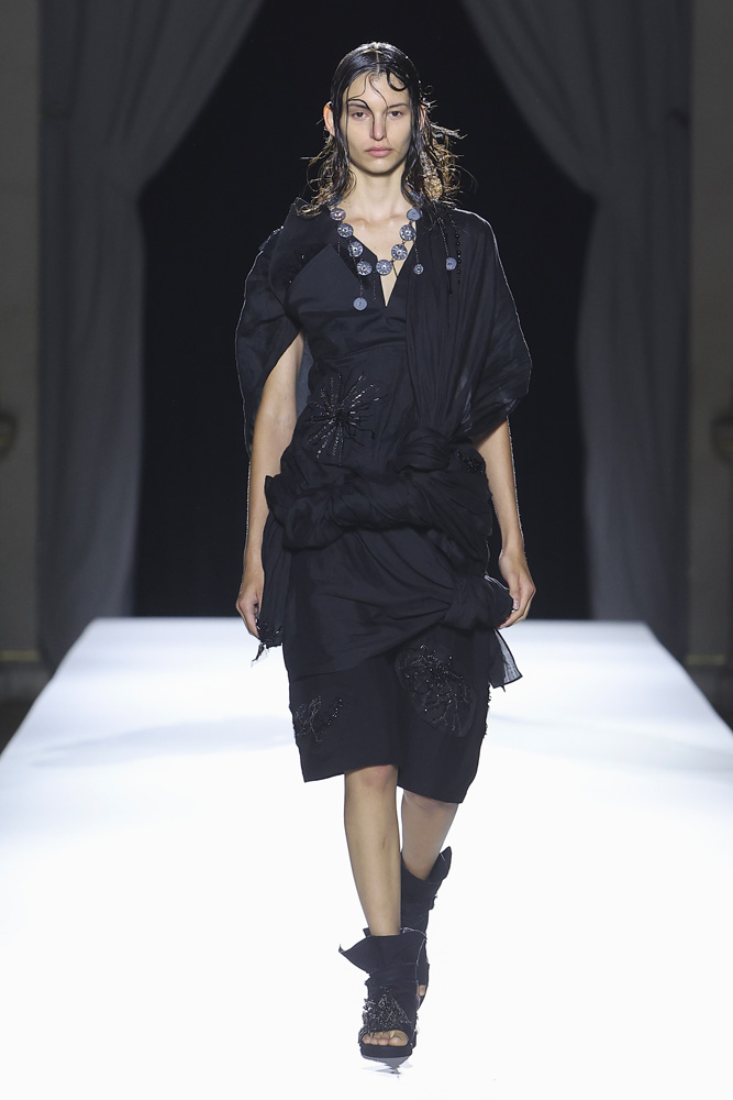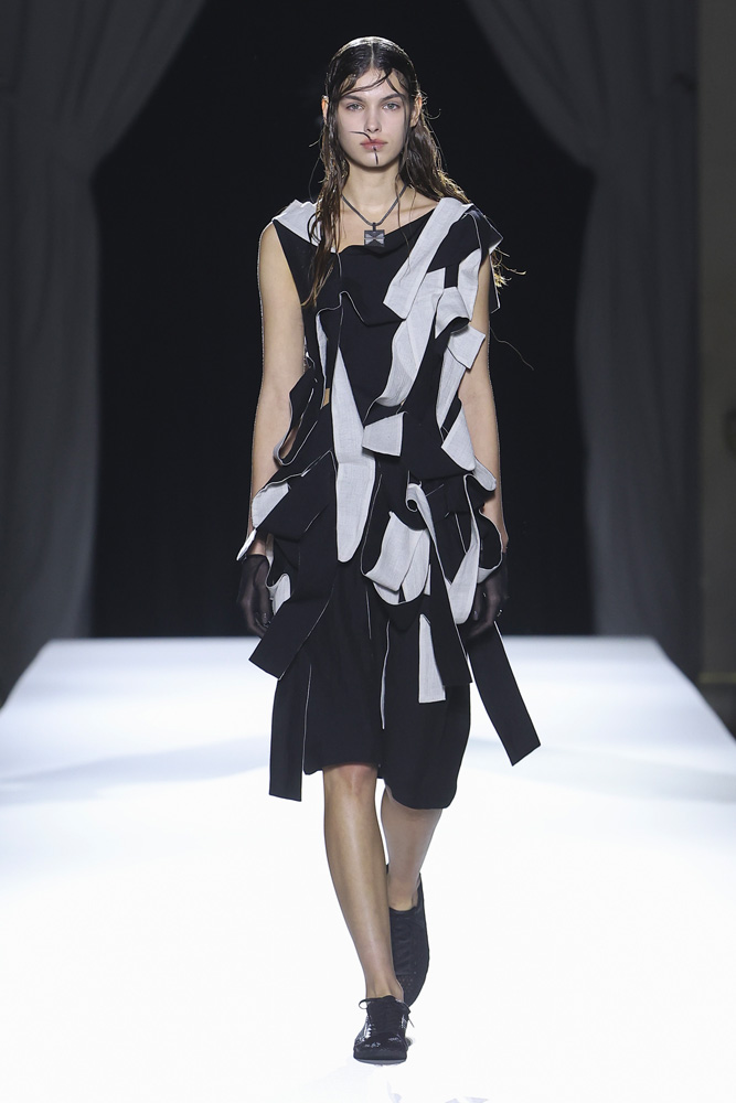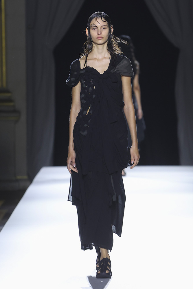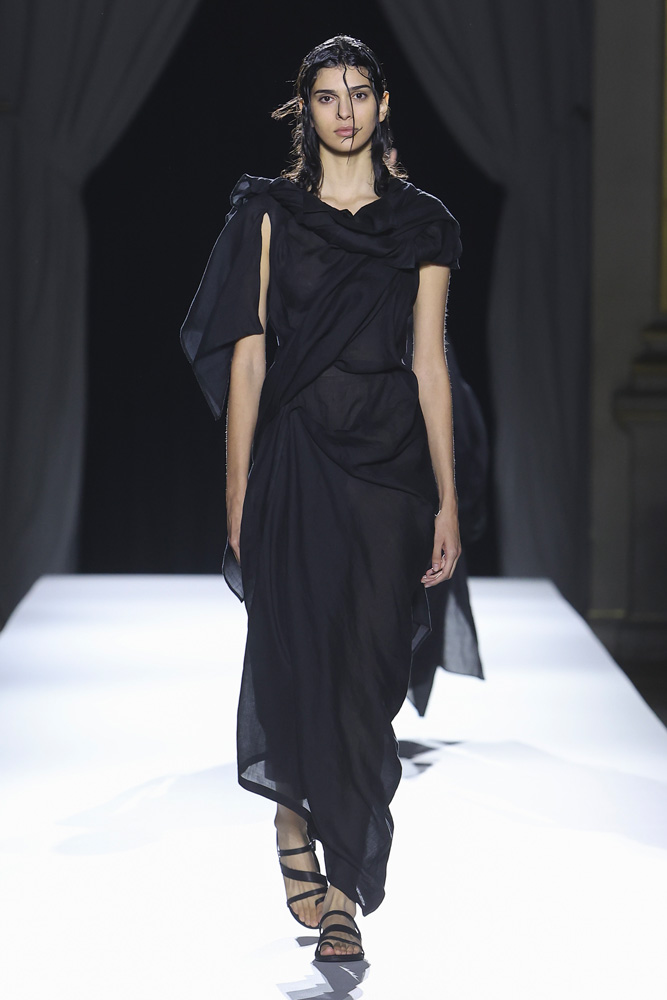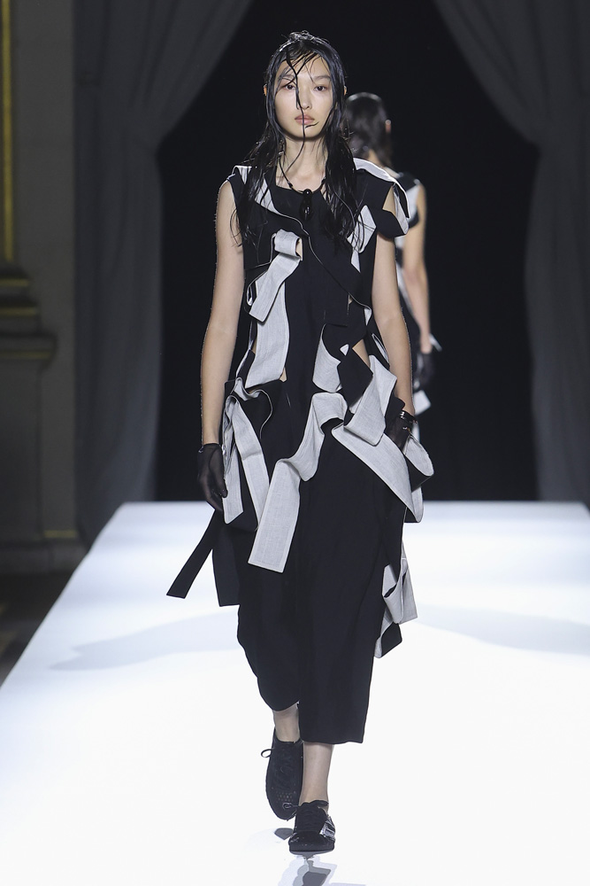 Comme à son habitude, le créateur de mode japonais a présenté une collection en plusieurs tableaux qui révèlent et renforcent les codes qu’il établit depuis désormais plus de 40 ans ; le contraste entre le noir et le blanc, une sensualité sobre qui se joue à travers la transparence textile, le drapé et les jeux de nouages retrouvés à travers plusieurs silhouettes. Les mannequins défilent comme des oiseaux virevoltant du jour au soir, comme une murmuration, ces vols de regroupements d’oiseaux qu’on ne saurait se lasser de regarder.