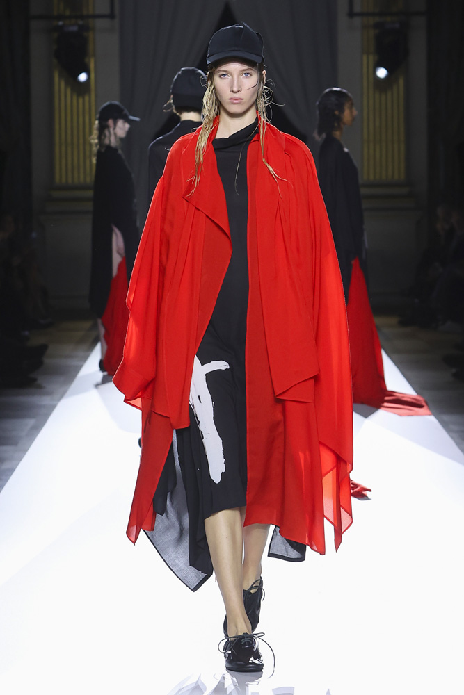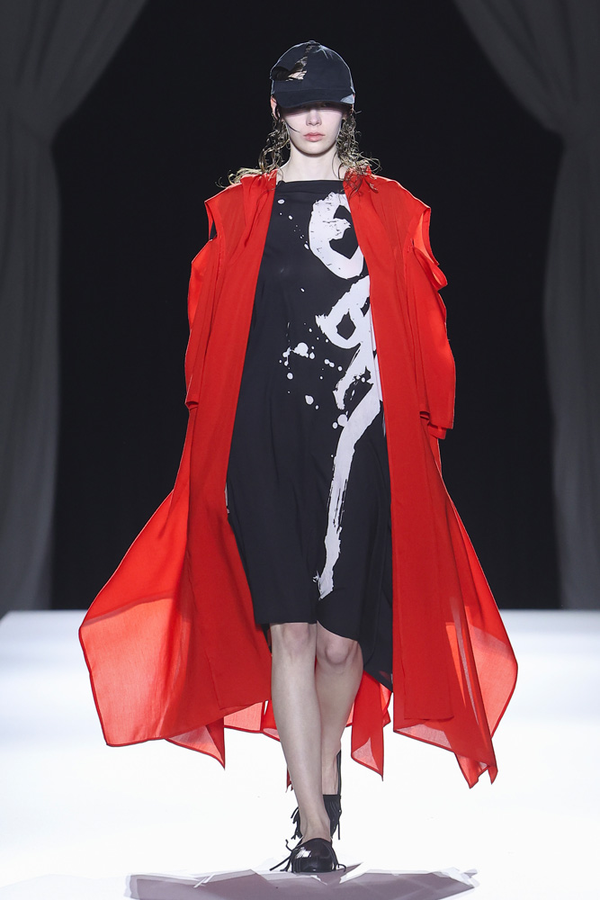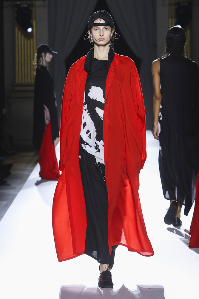 Pour son final, cinq silhouettes habillées d’un manteau rouge se sont suivies sur le podium, les mannequins les retirant et laissant paraître à leurs bras ce rouge éclatant. La dernière portait un manteau noir avec une tournure rouge s’échappant du dos, comme une longue traîne. Un clin d’œil à un manteau similaire présenté en 1986. “Avant la technique, une sensibilité aux formes et au volume du corps, entre autres, est indispensable. Tout commence par une émotion, c’est joli ça… ”, écrivait-il déjà, facétieux, dans My Dear Bomb, son autobiographie publiée en 2010. Quinze ans après l’écriture de ces mots, le mantra ne semble pas avoir changé tant, au sein de la maison Yamamoto, le temps semble n’avoir aucune emprise. Il est infini.