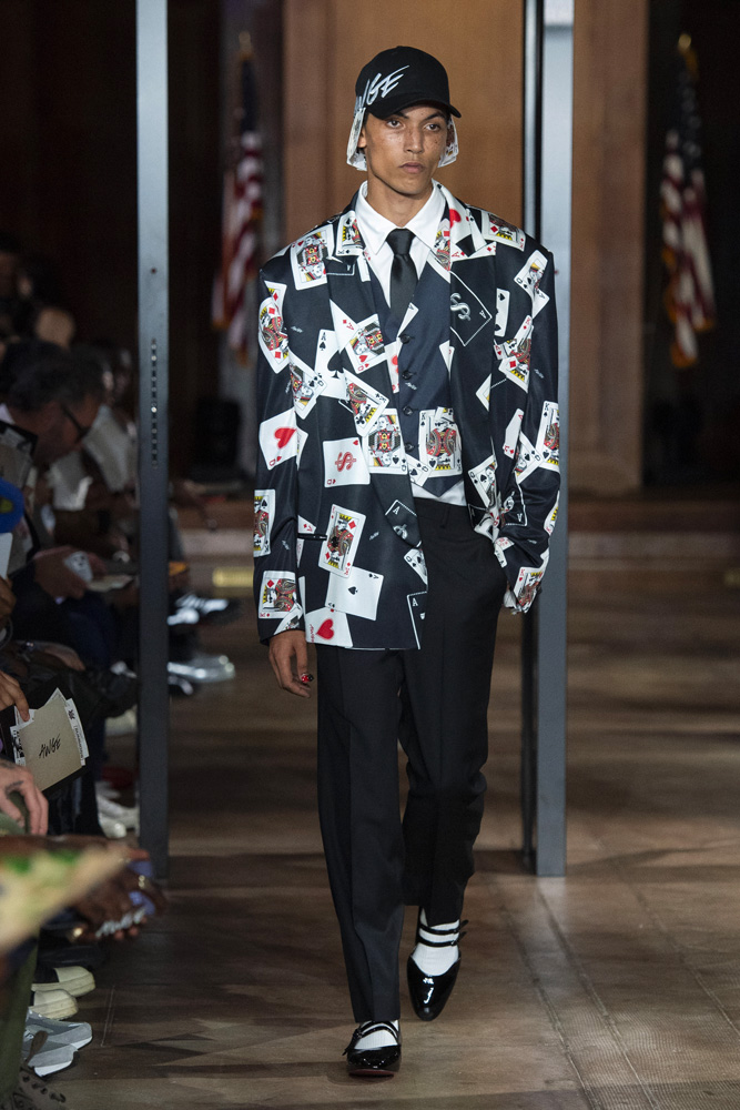 Portée par des collaborations avec Puma et Ray-Ban (deux marques dont il est directeur créatif), ainsi que par le chausseur Christian Louboutin, cette collection offre une réflexion plutôt intéressante sur la sémantique du vêtement. Notamment à la perception que l’on se fait d’une pièce en fonction de qui la porte. Ou alors comment détourner un look par le biais des proportions et des accessoires.
