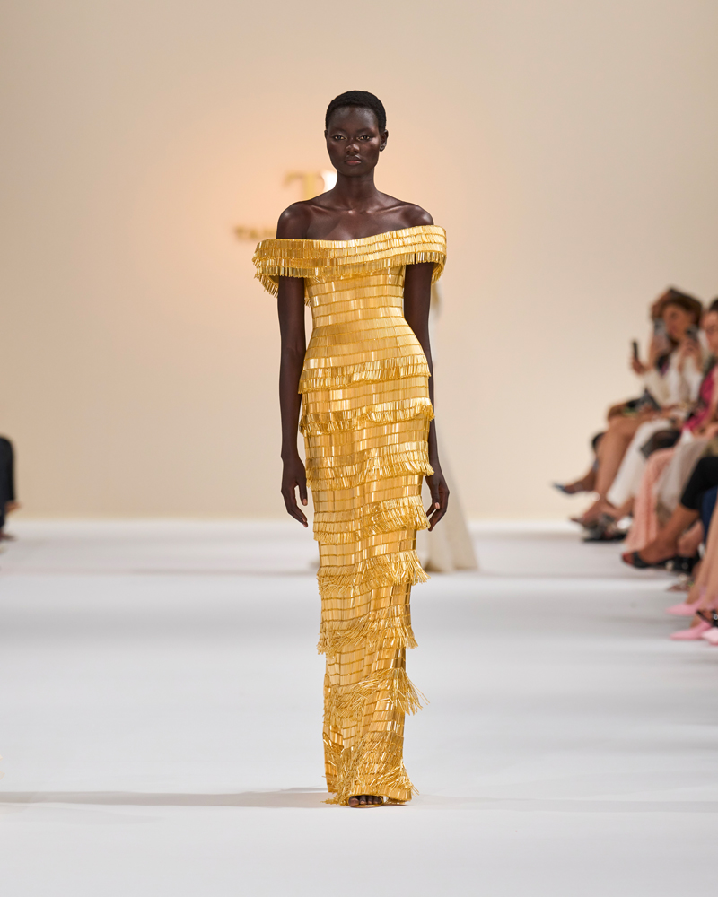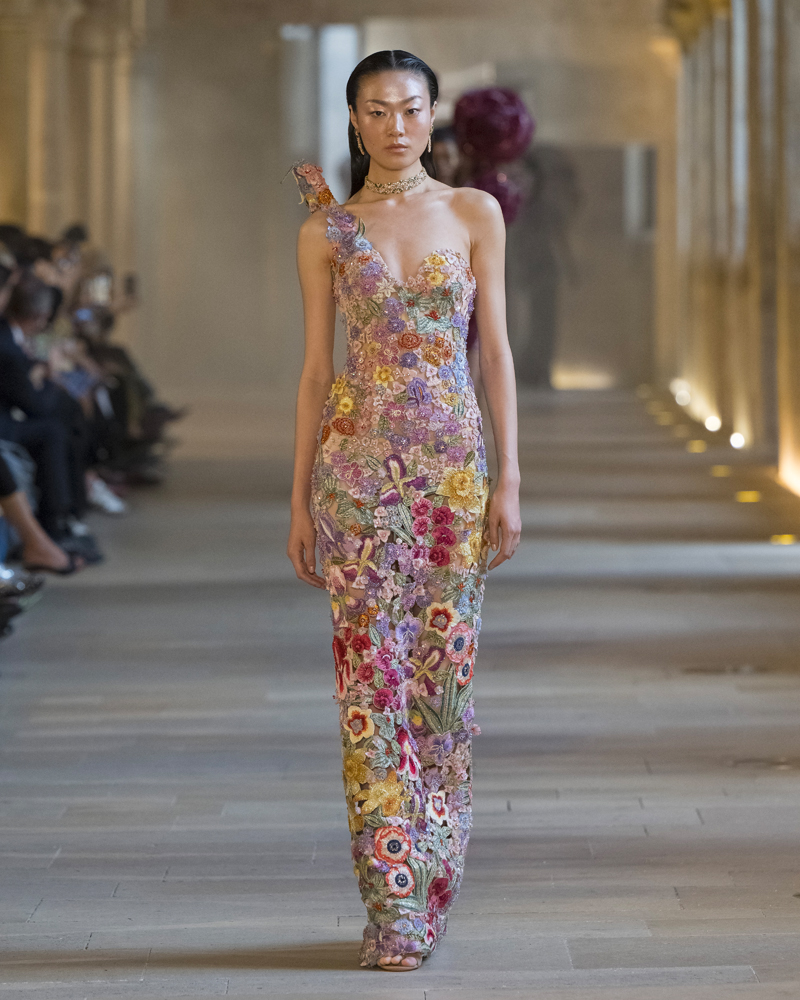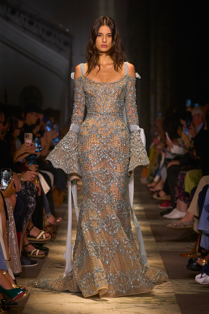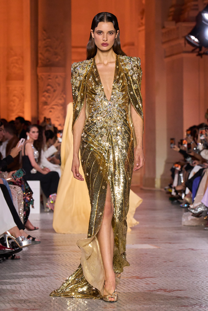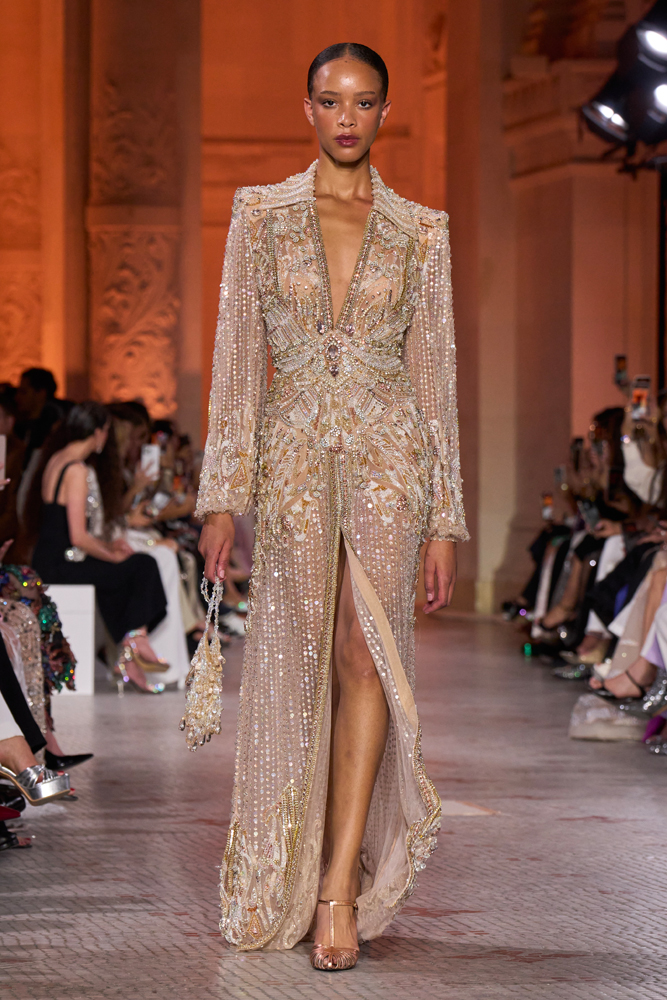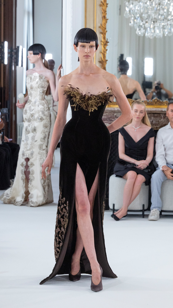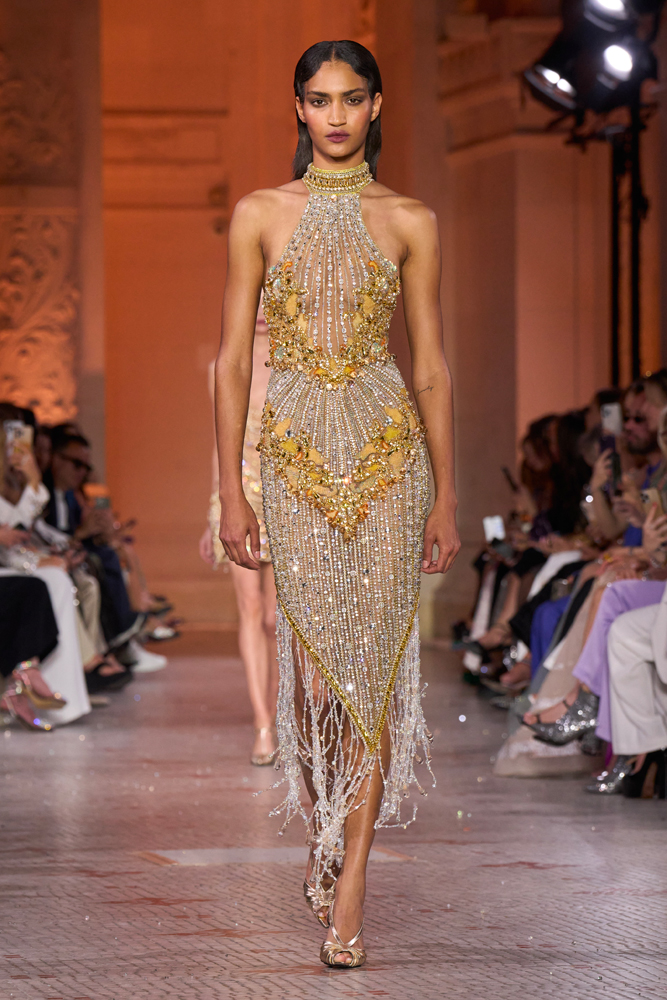 Tandis qu’Armani Privé, Zuhair Murad et Elie Saab la déploie en une série de magnifiques silhouettes semblables à des parures de bijoux. Chez Germanier, le strass recouvre les mannequins à même la peau, version futuriste, quand chez Tamara Ralph il incarne la haute couture à la perfection, au gré d’une robe bustier enveloppante, ou, chez Robert Wun, il adopte des couleurs vives et captivantes.