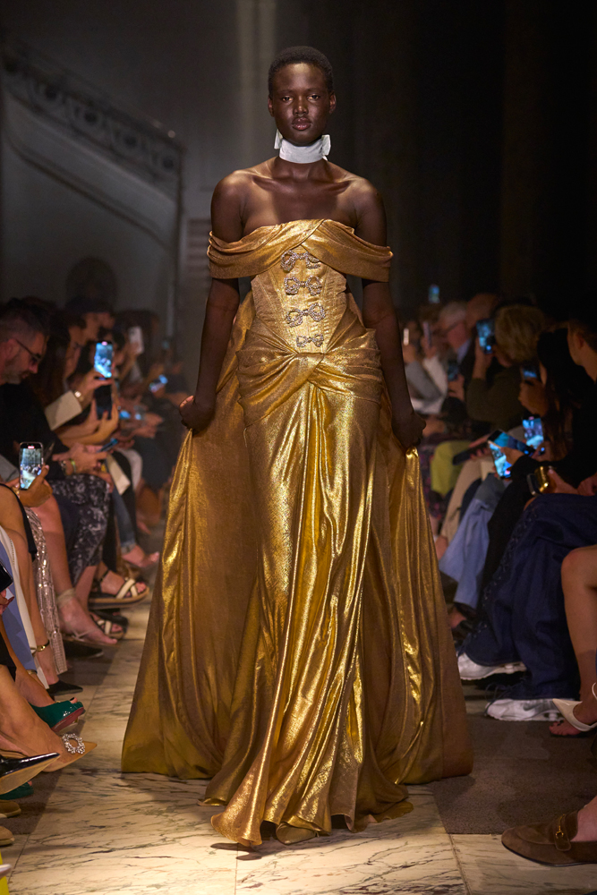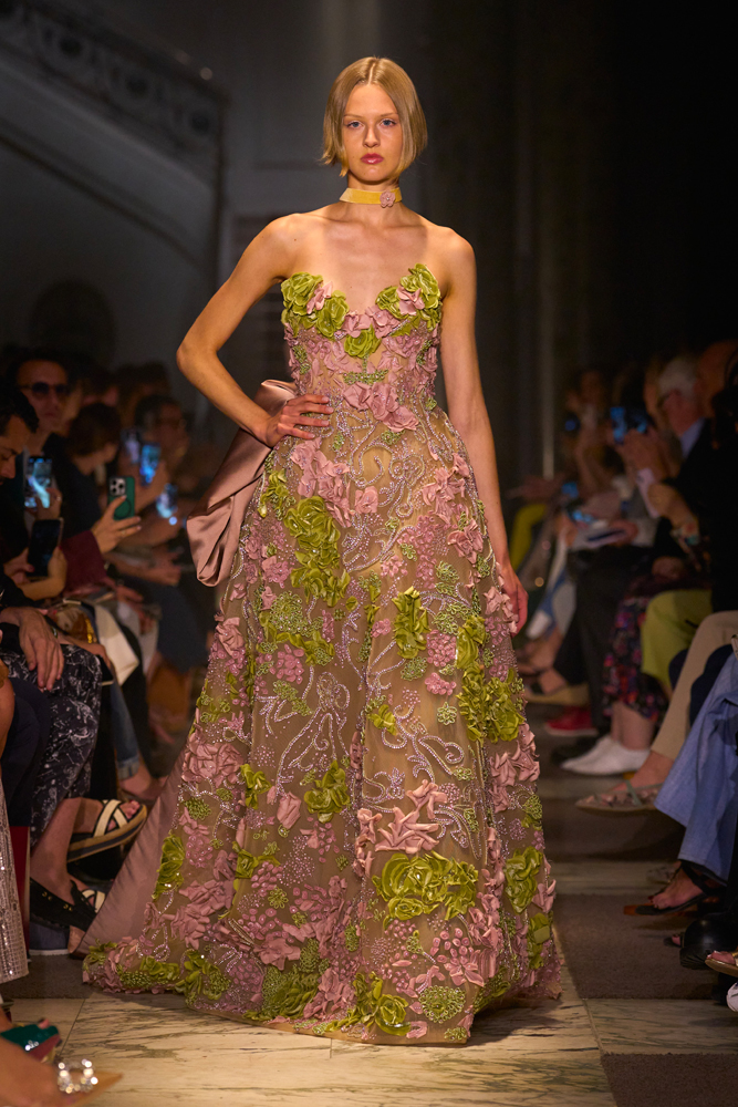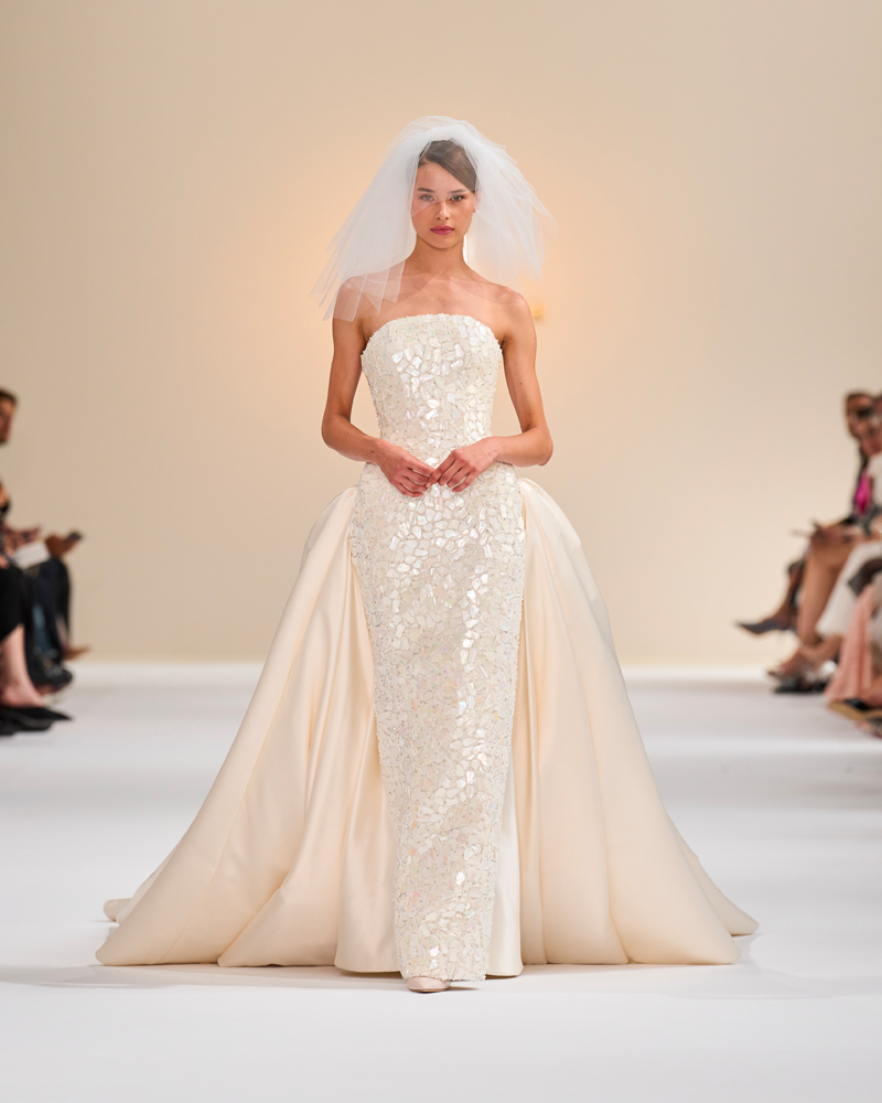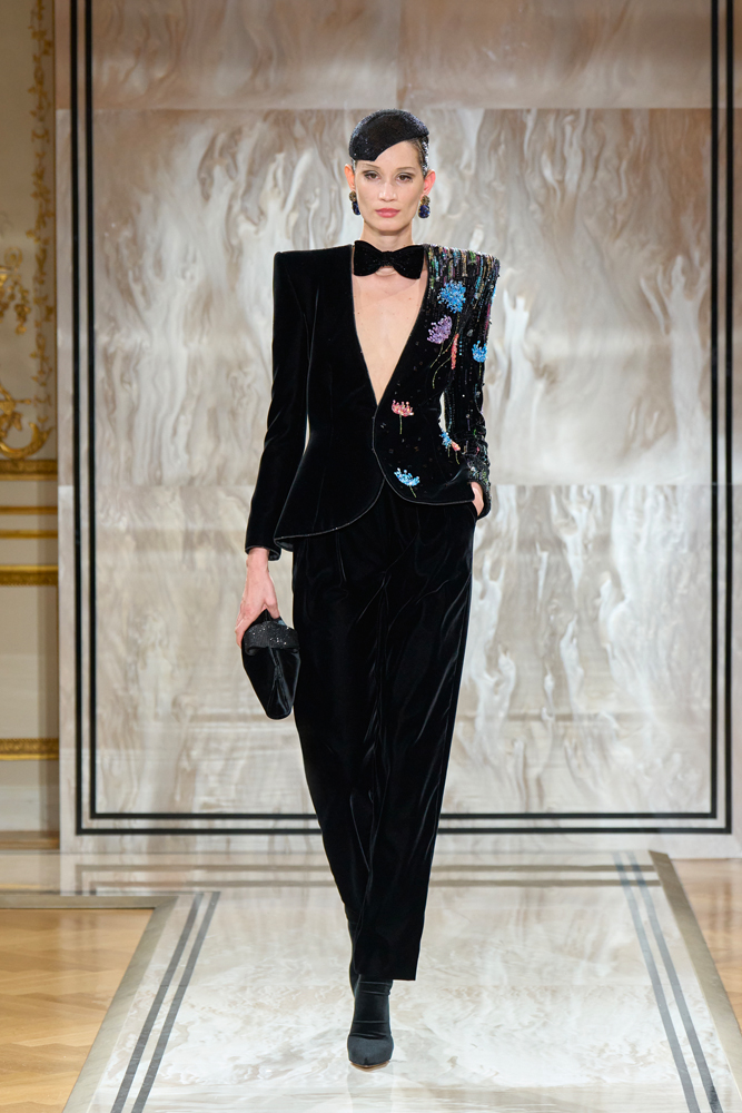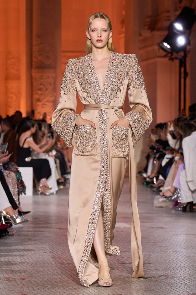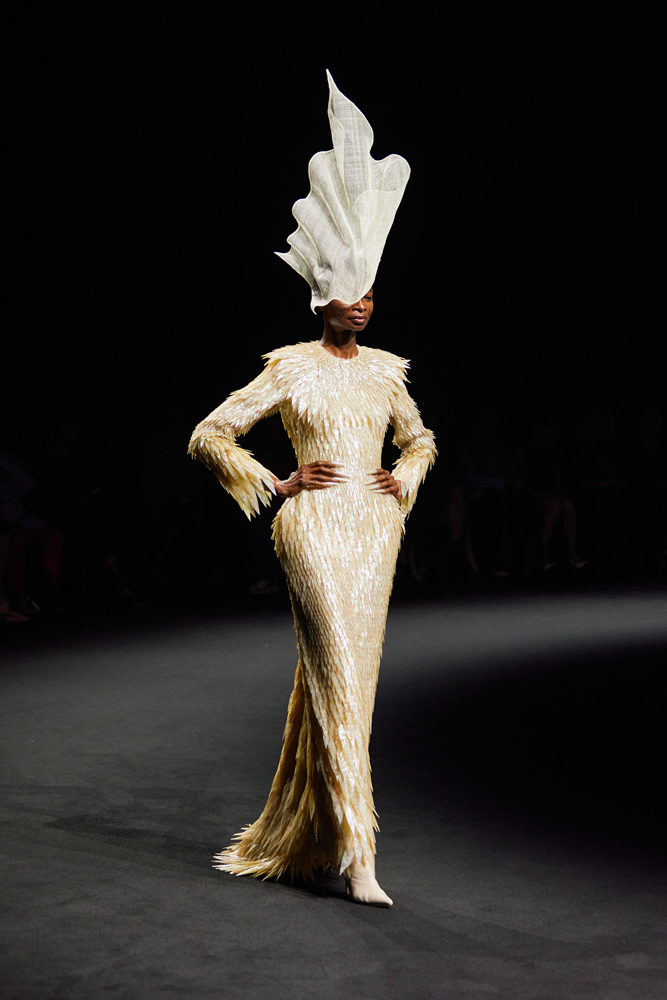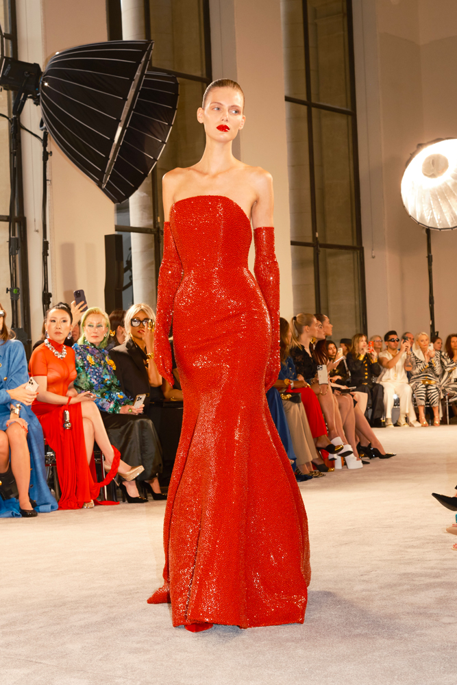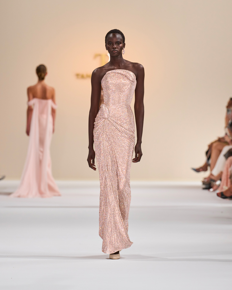 Tandis qu’Armani Privé, Zuhair Murad et Elie Saab la déploie en une série de magnifiques silhouettes semblables à des parures de bijoux. Chez Germanier, le strass recouvre les mannequins à même la peau, version futuriste, quand chez Tamara Ralph il incarne la haute couture à la perfection, au gré d’une robe bustier enveloppante, ou, chez Robert Wun, il adopte des couleurs vives et captivantes.