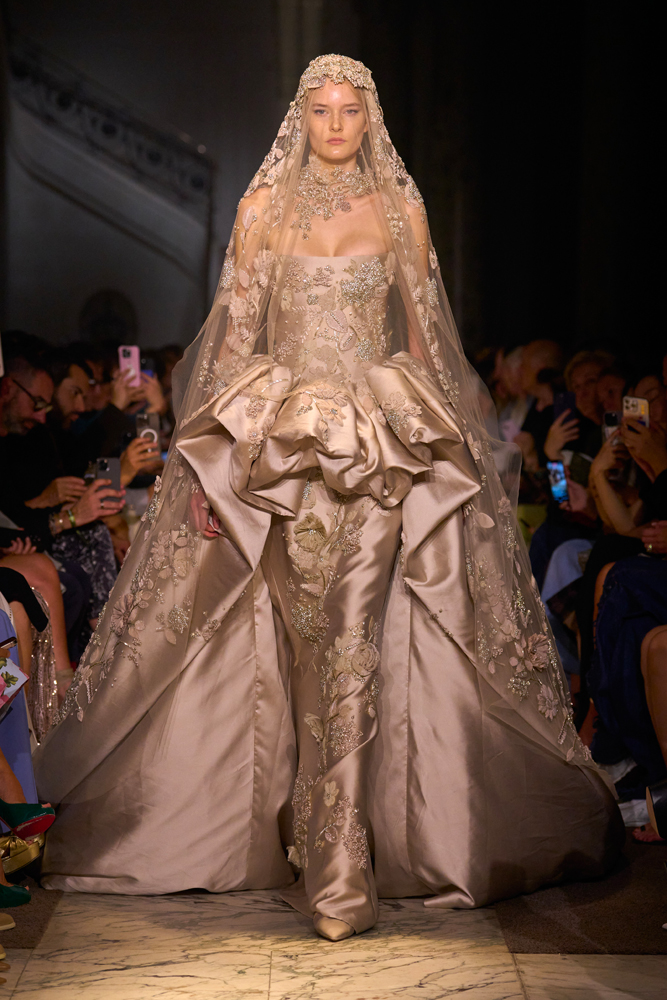 Chaque défilé de Fashion Week haute couture se clôture par une robe de mariée. Apothéose de savoir-faire et matières luxueuses, ce look incarne également l’identité mode de la maison. Évidemment poétique et sculpturale chez Iris van Herpen, elle se recouvre de dentelles chez Balenciaga et adopte une forme maximaliste fascinante. Innondées de broderies et de pierres précieuses chez Elie Saab, elle se réduit au minium chez Maison Margiela Artisanal (un voile, un corset, une traîne, sans artifices), tandis qu’elle se décore de bras surréalistes chez Robert Wun et d’un bol en argent massif sur la poitrine chez Yuima Nakazato.