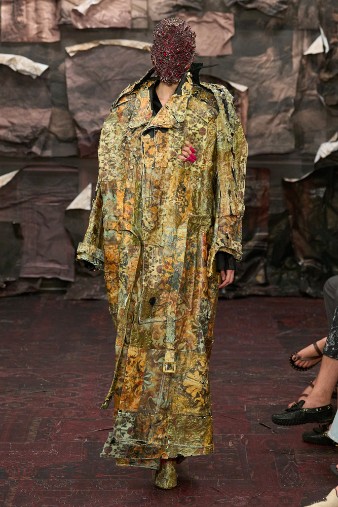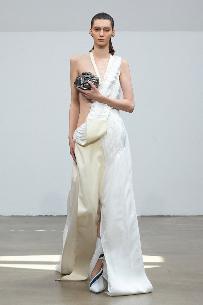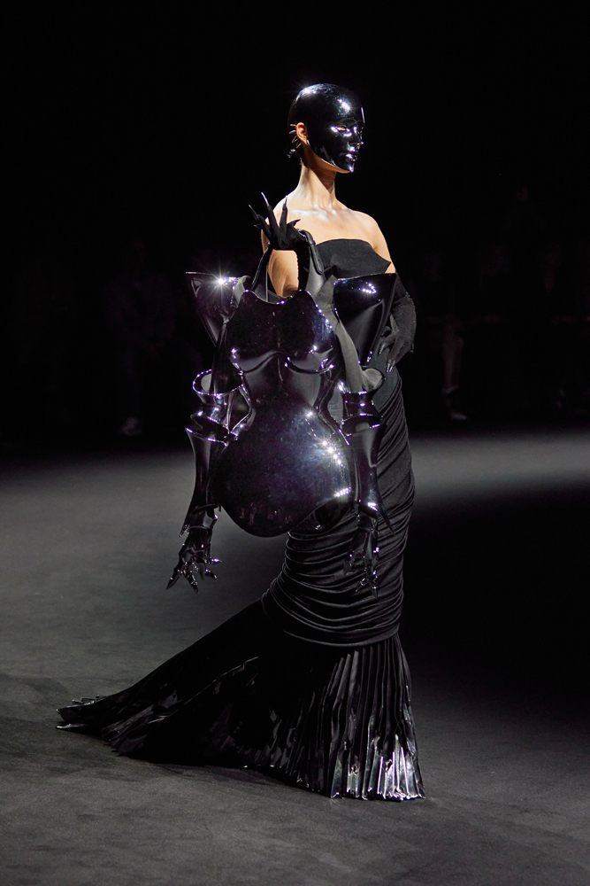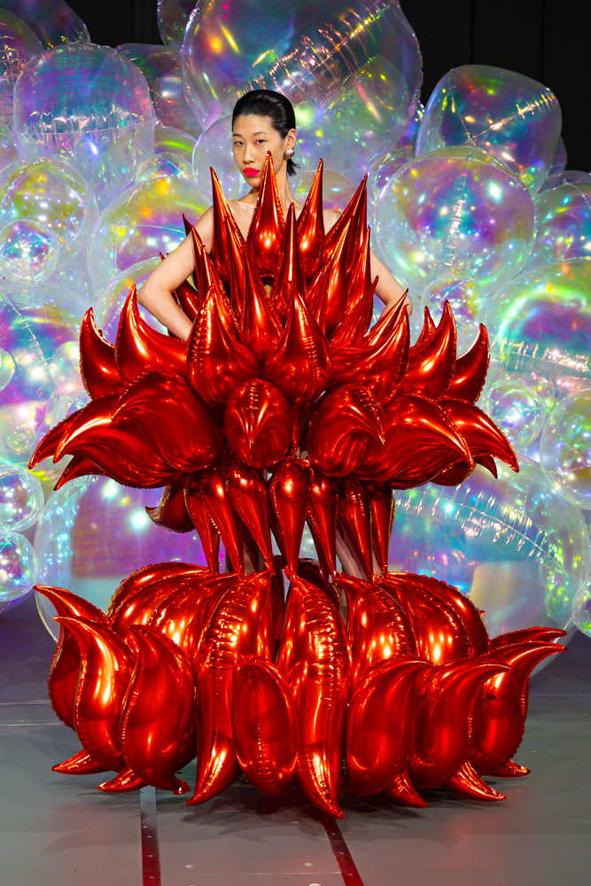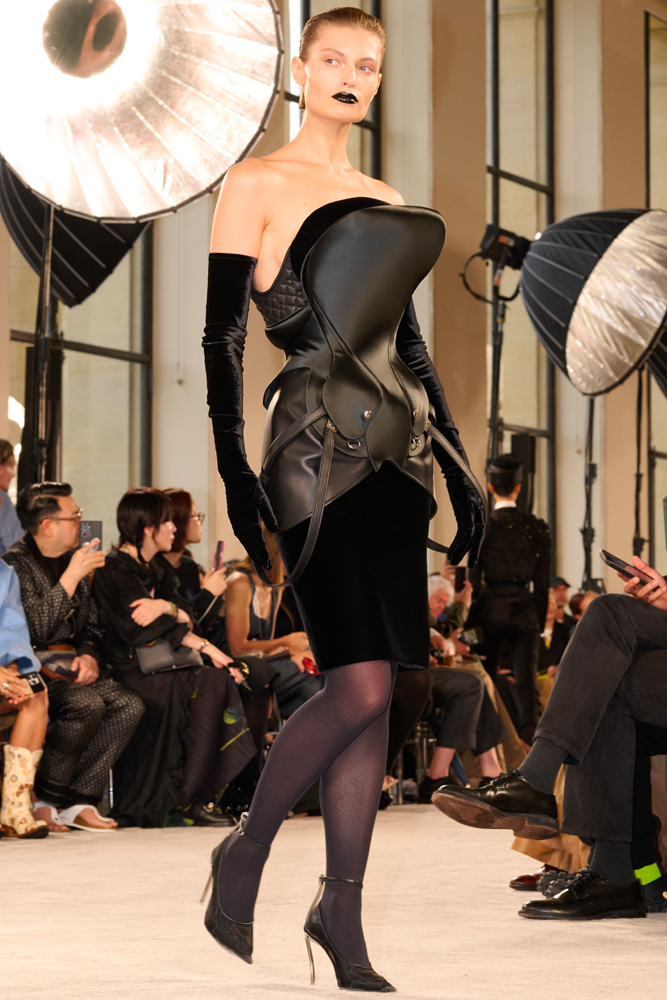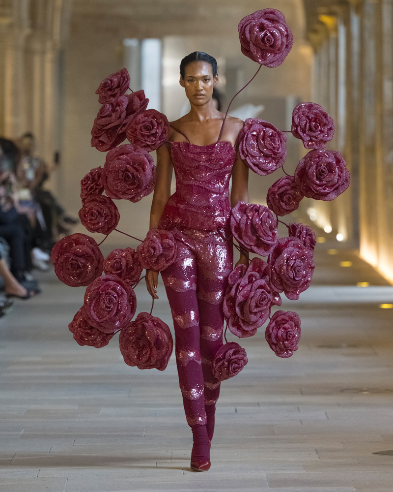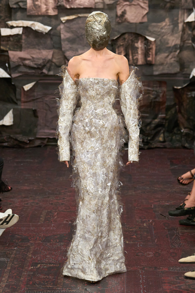 À l’image en effet du premier défilé de Glen Martens pour Maison Margiela Artisanal, où les mannequins s’avancent avec de larges masques obstruant leur vision. Ou encore de la robe au bustier en selle d’équitation chez Schiaparelli, suivie d’une autre brodée de perles et d’œils. Sans oublier les roses portées comme des mobiles autour des épaules des mannequins chez Rahul Mishra, et les looks en ballons gonflables chez Germanier.
