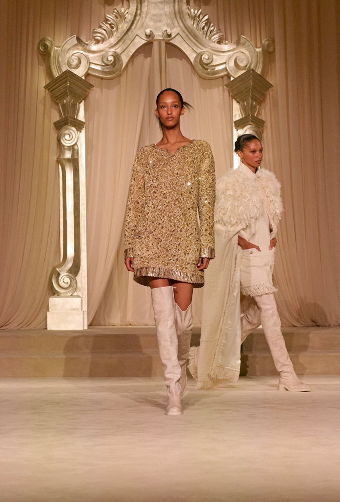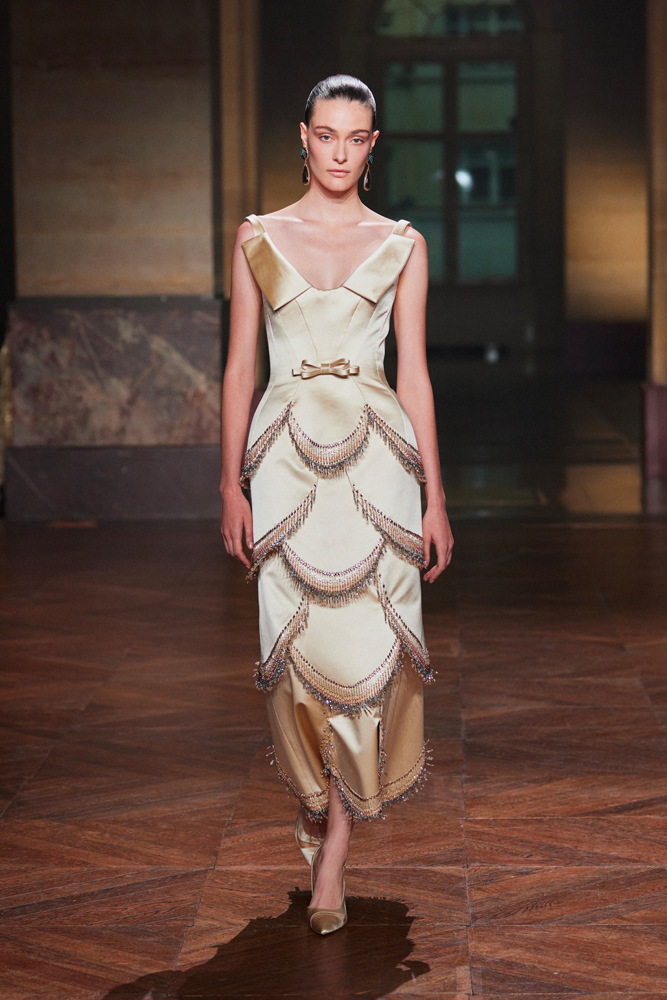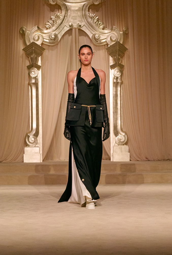 Si le vintage fait partie des tendances les plus fortes de ces dernières années, une nouvelle vague l’accompage depuis quelques saisons : l’esthétique old Hollywood. Léché et glamour, ce style entre Marilyn Monroe et Greta Garbo investit ainsi également les podiums de la Fashion Week haute couture. Version robe dorée à manches longues chez Chanel, elle se décline en bustier aux formes exagérées chez Schiaparelli, en bustier également chez Tamara Ralph orné de sublimes franges dorées, en robe-tableau inspiré de Klimt chez Rahul Mishra. Ou encore de façon plus littérale et chic chez Georges Hobeika, Elie Saab et Zuhair Murad…