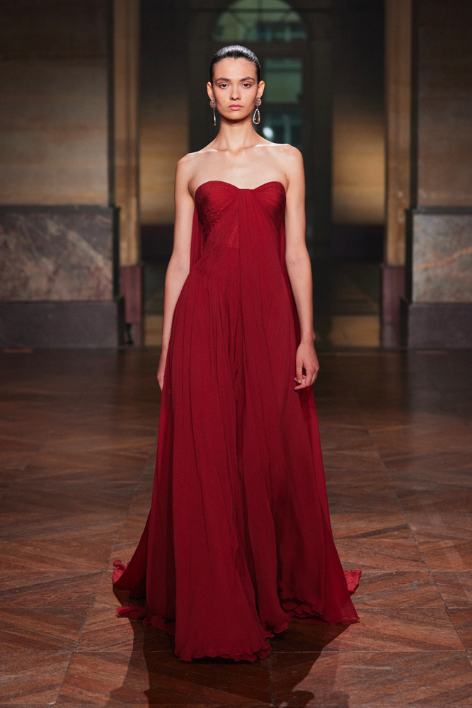 Idéale pour toute les carnations et pour toutes les chevelures, la robe rouge déploie une aura terriblement élégante et un poil sexy. Une notion dont les créateurs maîtrisent en effet, à l’image des ateliers Chanel qui en font un total-look en tweed, au même titre que Demna chez Balenciaga ou encore Robert Wun. Sans oublier la voluptueuse robe bustier à volants de Georges Hobeika ou les sublimes robes de Schiaparelli, version semi-transparente ou brodée d’écailles.