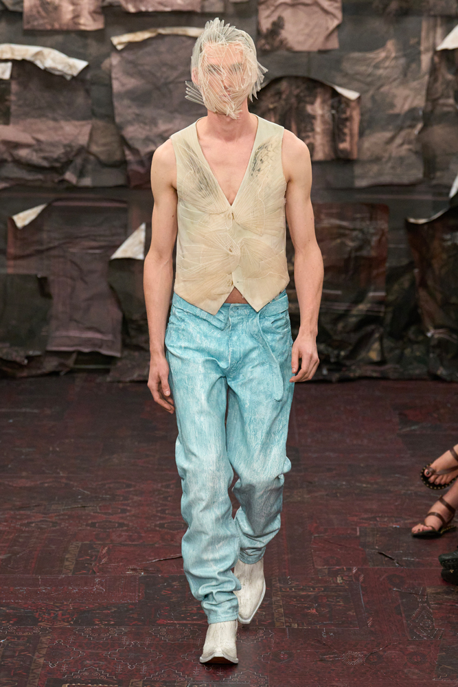 Puisque le diable se cache dans les détails, tout bon défilé haute couture se doit d’inclure des accessoires aussi minutieux et luxueux que les looks. Chez Yuima Nakazato, le bijou se transforme ainsi parfois en top, tandis qu’il accompagne symboliquement la plupart des silhouettes très politiques du créateur japonais.