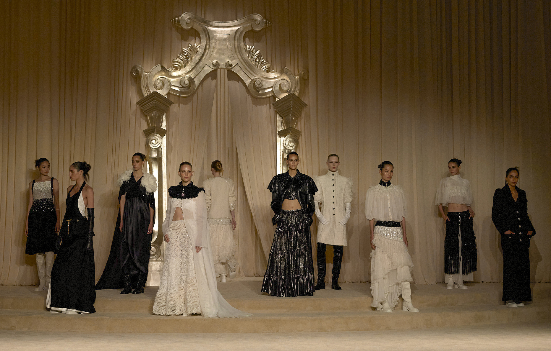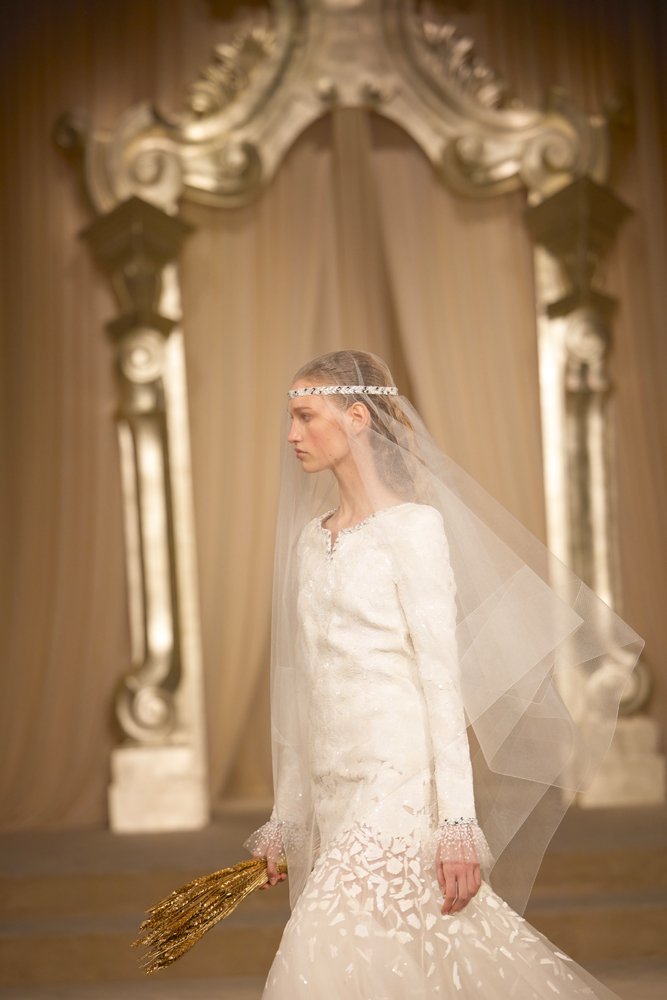 Signée Lorraine Schwartz, la joaillerie de la collection Balenciaga se déploie donc entre parures argentées et sac dorés. Chez Chanel, les accessoires traduisent également l’inspiration du défilé : en témoigne un bouquet d’épis de blé en or tenu dans les mains de la mariée. Sans oublier les fascinants masques incrustés de pierres ou fabriqués en tulle chez Maison Margiela Artisanal, qui ont ainsi provoqué beaucoup de réactions dans l’assemblée.