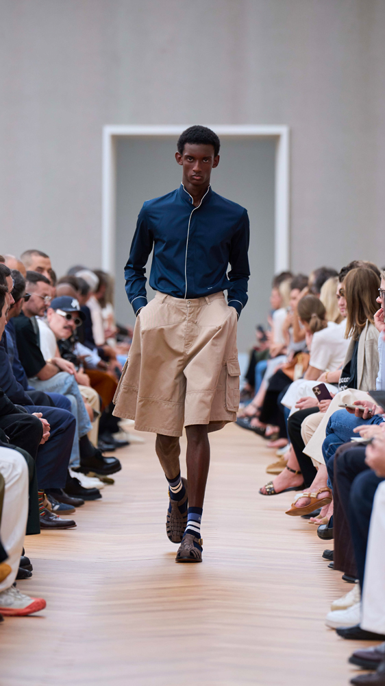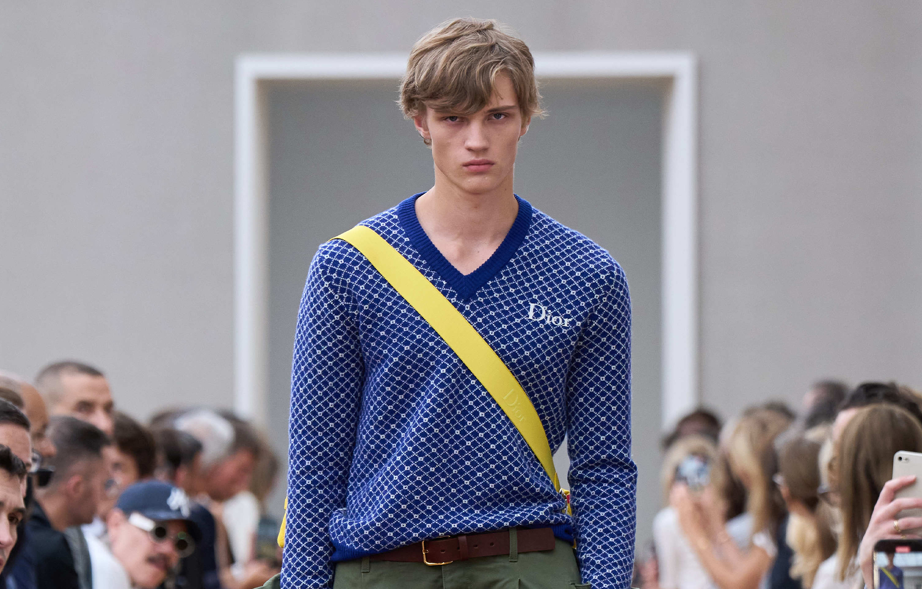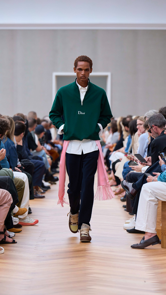 Discrètement brodé sur le rebord bas d’une maille et d’un pull ou sur une cravate (portée notamment par ASAP Rocky, présent au premier rang), le logo Dior fait son grand retour au sein du vocabulaire mode de la marque. De façon plus littérale, il recouvre également la partie haute d’un pull irlandais ou encore la languette d’une paire de sneakers. Bref, un détail pour vous… mais pour nous, il veut dire beaucoup.