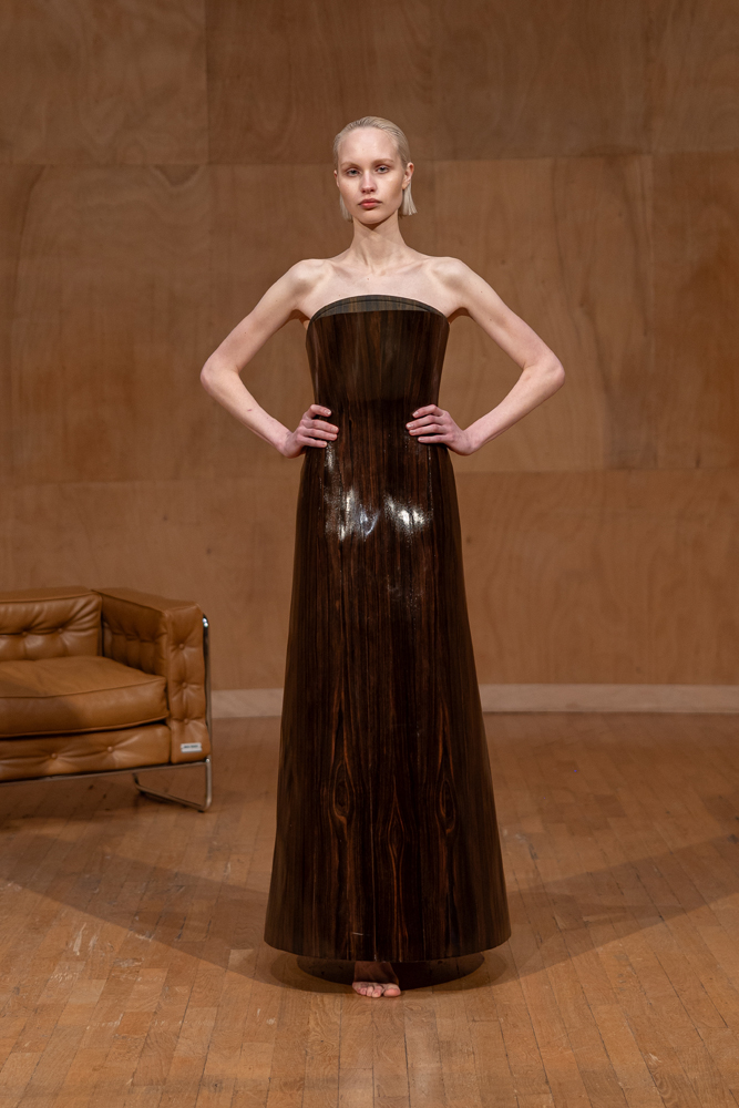 Minimaliste dans sa forme, cette robe bustier épouse les courbes du corps tout en conservant une certaine rigidité. Contrairement à d’autres silhouettes du défilé où le motif “bois” apparaît en trompe-l’œil – comme sur un tailleur en cuir et vinyle reproduisant les rainures du bois alentour –, cette robe a été conçue en bois véritable.
