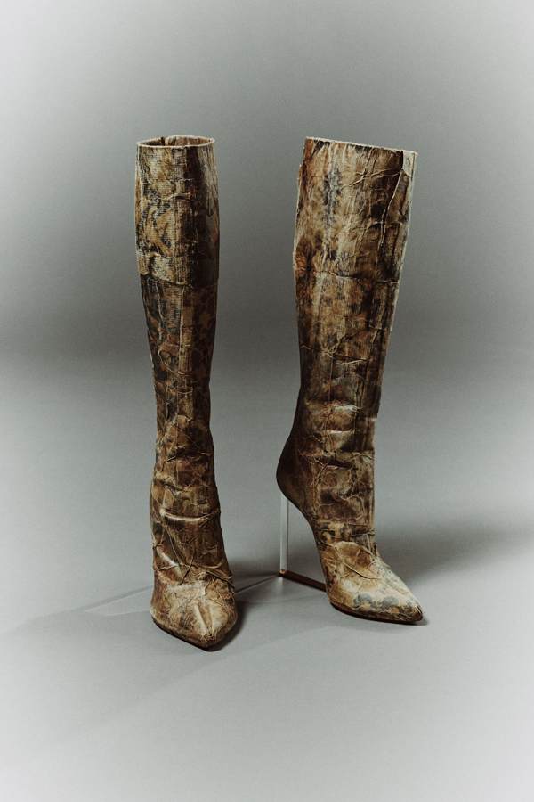 Enfin, qui dit Maison Margiela dit forcément Tabi. Redessinée à l’infini, la célèbre chaussure fendue est une nouvelle fois réinterprétée. Sous la forme d’une botte en cuir ou en brocart et d’une sandale à brides, chaque paire est sublimée d’un talon compensé transparent. Un détail signature, dessiné par Martin Margiela lui-même en 1998.