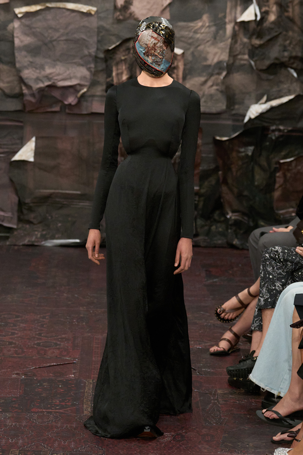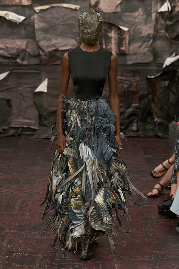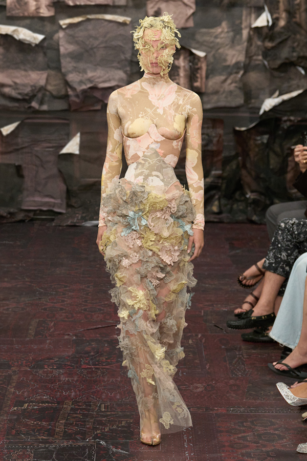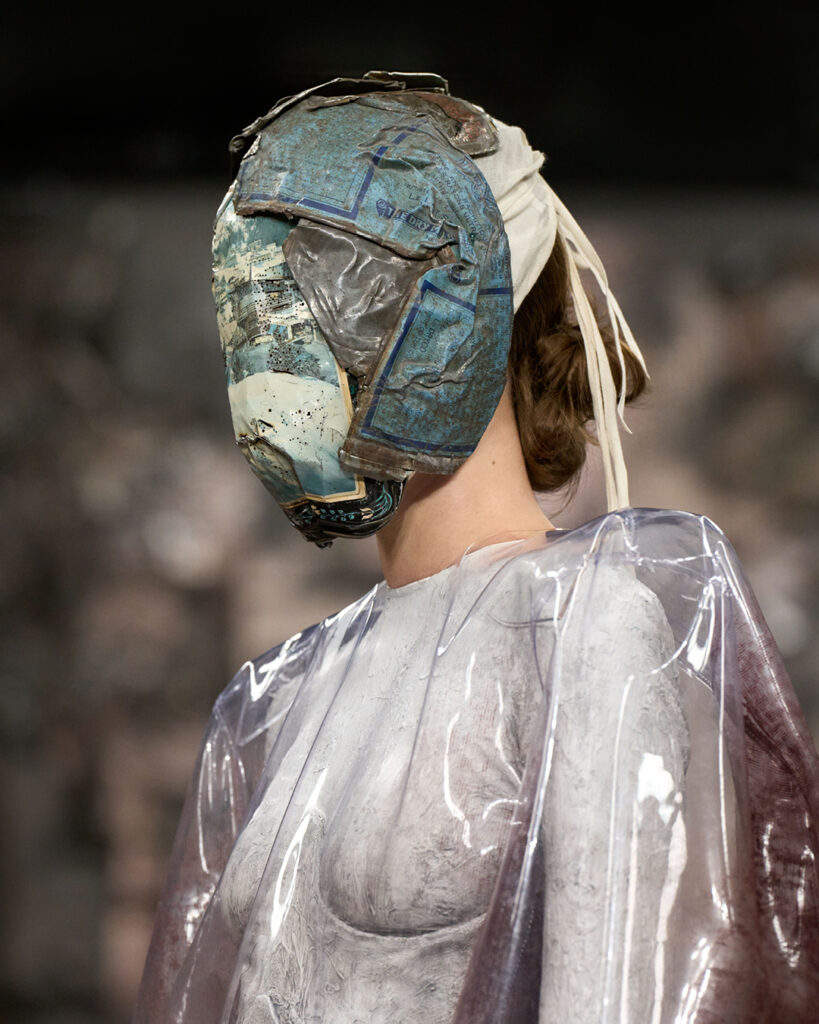 À une époque où les défilés s’apparentent souvent à une course aux top models, Glenn Martens perpétue la quête d’anonymat, initiée par Martin Margiela dès les débuts de la maison. À travers des masques noués à l’arrière de la tête – dont certains ont été conçus à partir de vieilles boîtes métalliques compressées – et des voiles dissimulant les visages de chaque mannequin, le créateur belge recentre notre attention sur l’essentiel : le vêtement et le savoir-faire.
