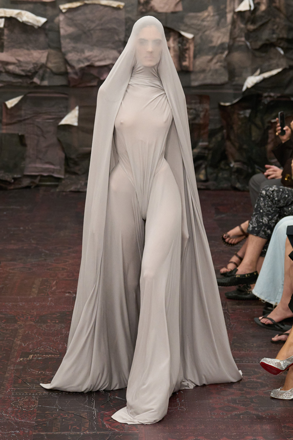 Sans oublier les silhouettes sculpturales évoquant la statuaire des églises gothiques, telles des robes de jersey transparent, rehaussées de corsets aux multiples laçages marquant la taille et accentuant les hanches.