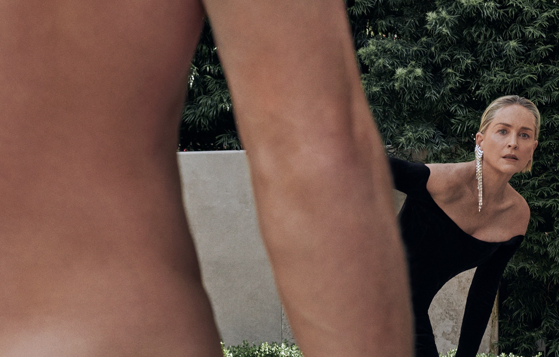 Influencés par les thrillers des années 90, et certaines campagnes Mugler léchées signées Guy Bourdin et Helmut Newton, les clichés montrent une Sharon Stone aussi vénéneuse que sculpturale. La star âgée de 67 ans apparaît ainsi assise, triomphante, vêtue d’un blazer ouvert sur une poitrine nue et de talons hauts à côté d’un homme simplement vêtu d’un sous-vêtement.