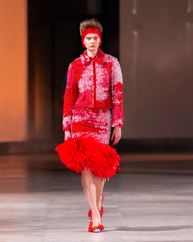 Son univers visuel se déploie comme une constellation vivante. Chaque silhouette semble ainsi réactiver un souvenir de collection passée : les robes étincelantes de l’automne-hiver 2024–2025, portées en clôture de show par La Grande Dame ; les cristaux et perles des tenues automne-hiver 2023–2024 ; ou encore les mailles sculptées qui rappellent sa capsule Prélude conçue avec LVMH.