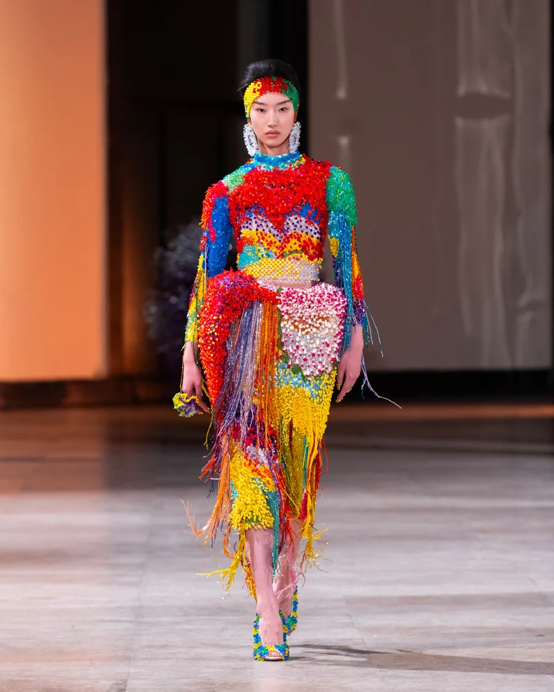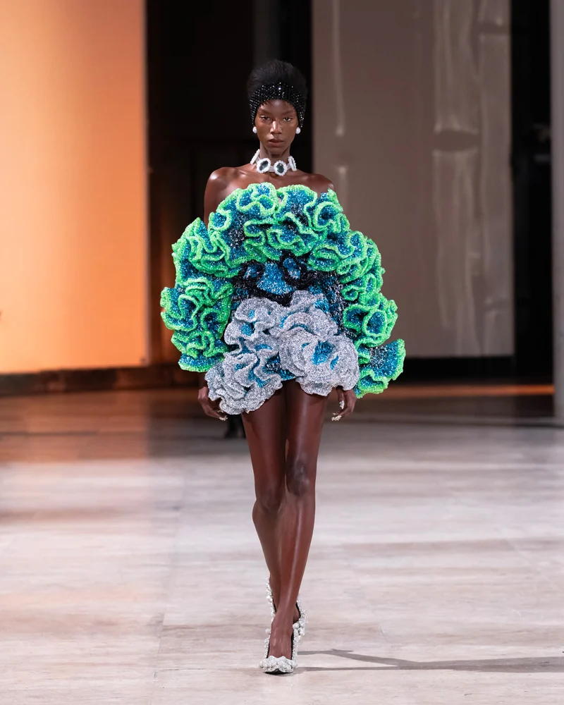En janvier 2025, il clôt la Semaine Couture de Paris avec une collection spectaculaire. Robes perlées, franges kaléidoscopiques, bustiers asymétriques : il réinvente la haute couture sans jamais trahir son ADN. Il prouve que l’écologie peut briller — et faire rêver.