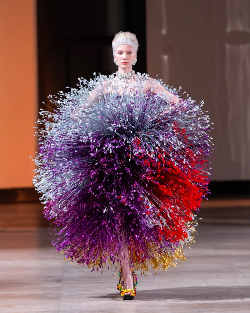 Depuis ses premières pièces jusqu’à sa collaboration récente avec LVMH, il trace une ligne claire : sublimer le délaissé, réenchanter ce qui a été oublié. Cette esthétique joyeuse et consciente prend un nouvel élan avec son tout premier défilé haute couture.