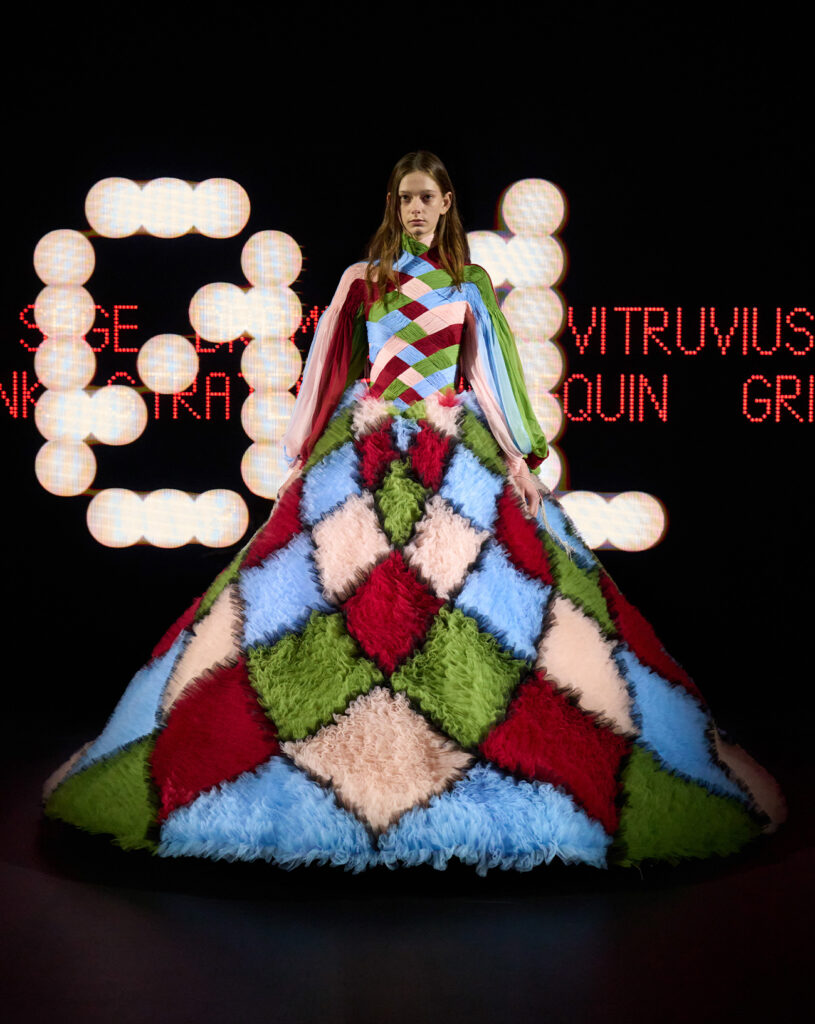 En janvier 2025, Alessandro Michele a ouvert une nouvelle page avec le défilé « Vertigineux » dans l’ancienne Bourse de Paris. Dès l’entrée, le public baignait dans une atmosphère onirique : une obscurité profonde, des gradins vertigineux et des sons industriels influant sur l’émotion collective. Puis les modèles sont apparus, porteurs d’une poésie visuelle : des robes en mousseline tourbillonnante, des motifs harlequin, des plumes dramatiques, des capes diaphanes, et même une robe rouge signature évoquant les grands maîtres de la peinture. Chaque tenue incarnait à la fois la technique d’un savoir-faire couture et la liberté d’une imagination surréaliste, métamorphosant le lieu historique en une scène absurde et fascinante