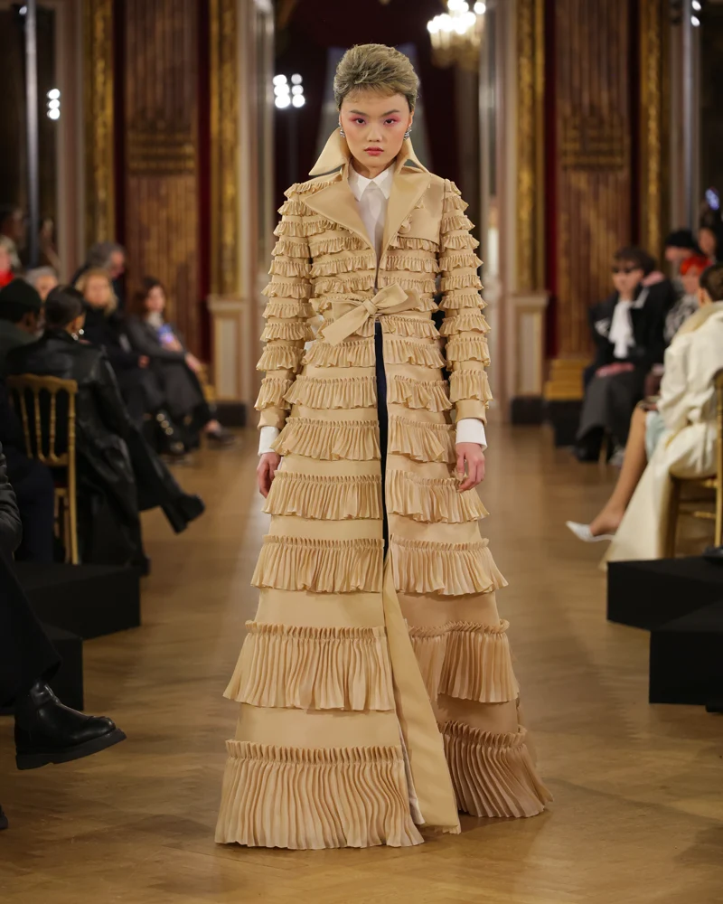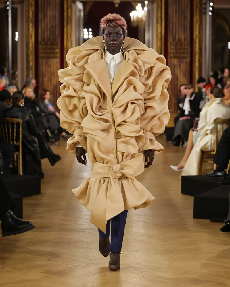Dès leurs premiers pas, ils mêlent performance et couture, remportant un prix au festival de Hyères et présentant des silhouettes sculpturales qui défient les codes. Très vite, la maison se distingue comme un laboratoire artistique où l’expérimentation devient signature.