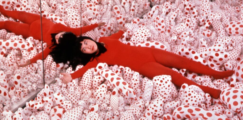 Contre l’avis de sa famille, elle rejoint les Beaux-Arts à Kyoto, mais rêve très vite d’un horizon plus vaste. En 1957, à seulement 28 ans, elle s’envole pour New York, seule et sans attaches, avec pour tout bagage une valise de toiles et une rage de créer. Là, dans une scène artistique masculine et féroce, elle impose peu à peu sa signature : des répétitions infinies, des pois, des installations immersives, des performances radicales. L’infini devient son territoire. Elle peint, sculpte, performe. Elle crée des “Infinity Rooms”, des espaces miroirs où l’on se perd dans une poésie cosmique.